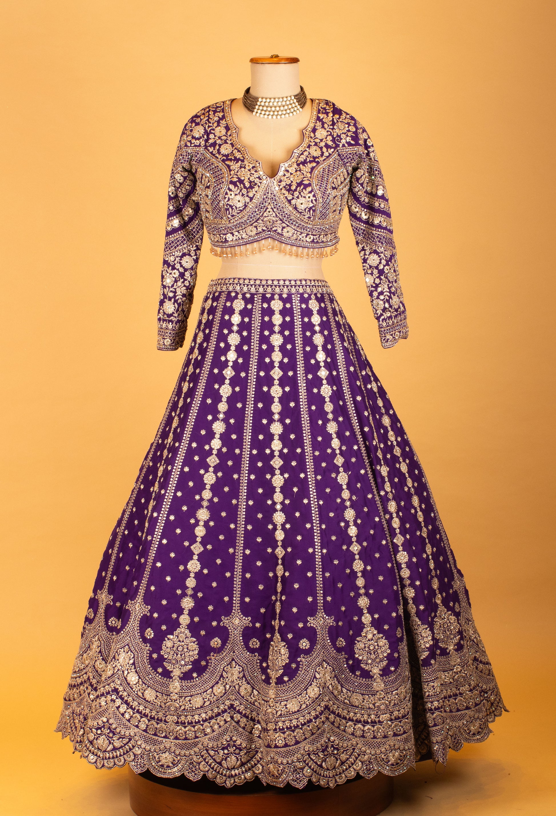 Step into true royal elegance with this breathtaking royal purple bridal lehenga choli set. Featuring heavily embellished silver thread work, mirror accents, and detailed sequin patterns, this outfit delivers an opulent and glamorous celebration style.