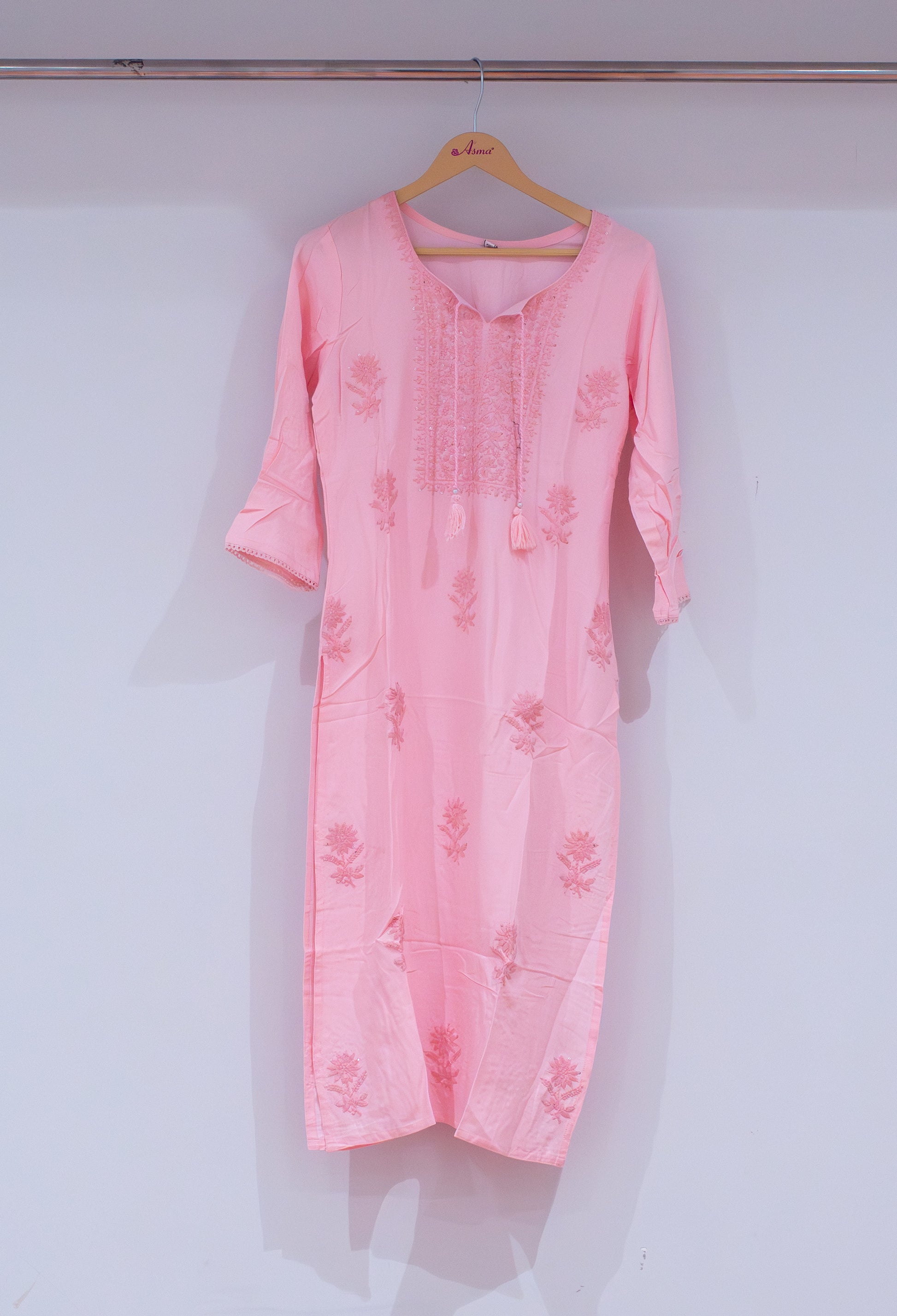 Add a touch of elegance to your everyday ethnic wardrobe with this soft pink embroidered kurti for women, designed to offer comfort, grace, and timeless style. Featuring a beautifully embroidered yoke with delicate floral motifs and a tassel tie-up neckline, this kurti blends traditional charm with modern simplicity.