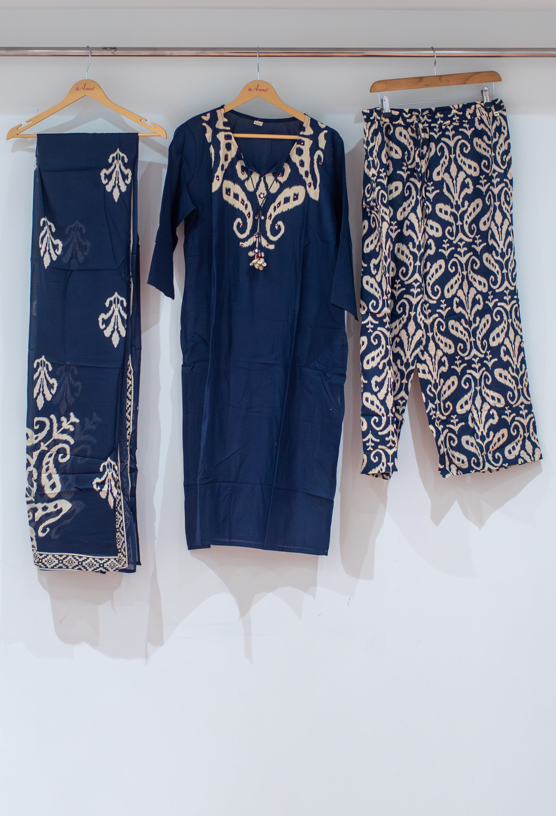 Upgrade your ethnic wardrobe with this stylish navy blue kurta set, designed for women who love effortless elegance. Featuring a beautifully printed straight-cut kurta, coordinated tapered pants, and a matching printed dupatta, this set is perfect for festive occasions, casual gatherings, and everyday ethnic wear.