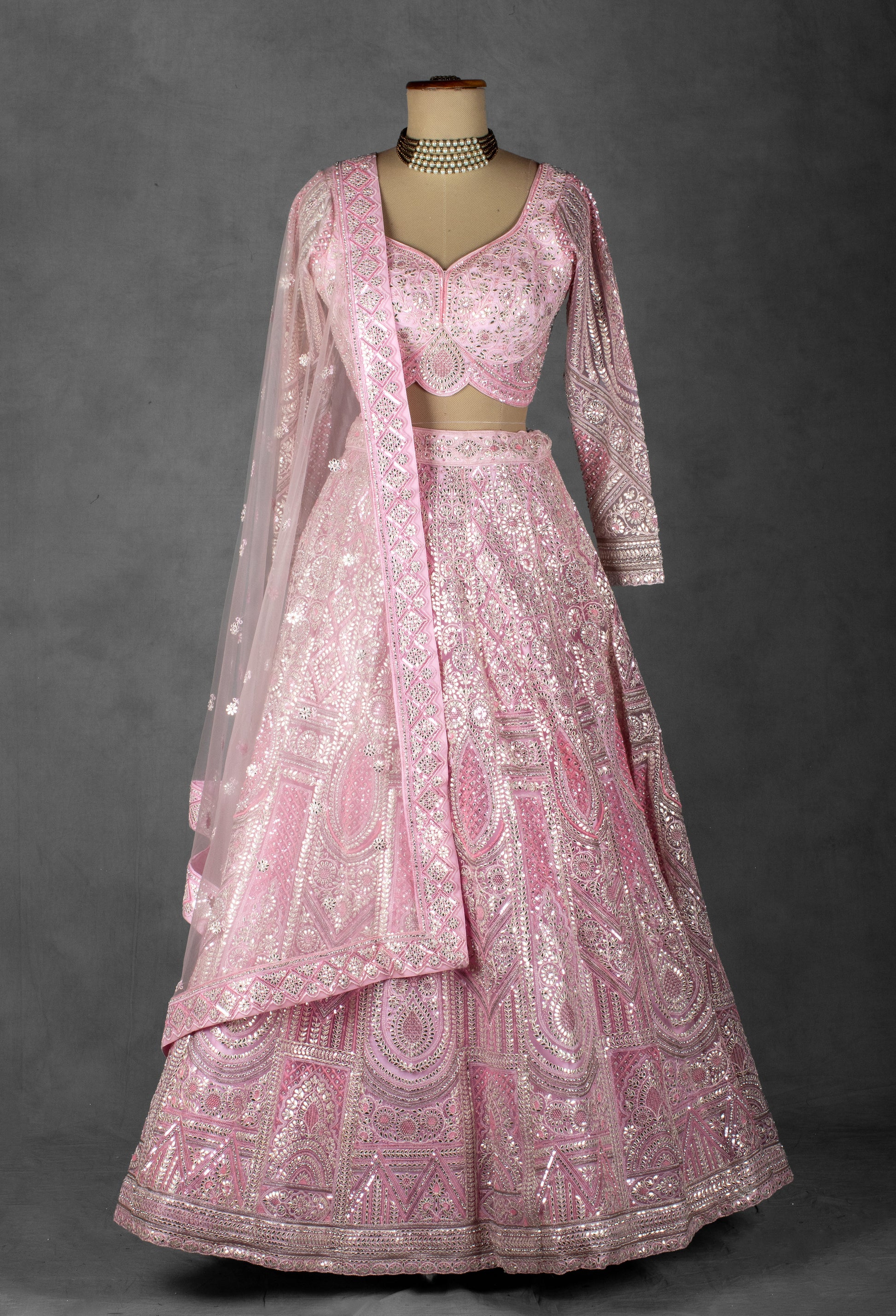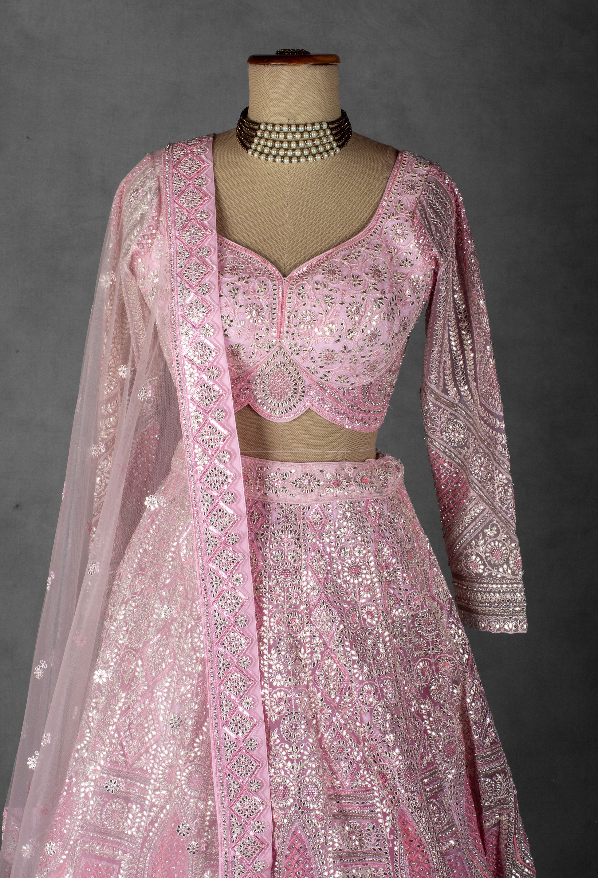 Step into ethereal elegance with this baby pink mirror and sequin embroidered crop top lehenga set, a flawless symphony of pastel charm and refined glamour. The sweetheart neckline crop top features delicate mirror, sequin, and zari embroidery, meticulously hand-embellished to create a romantic shimmer with every movement.