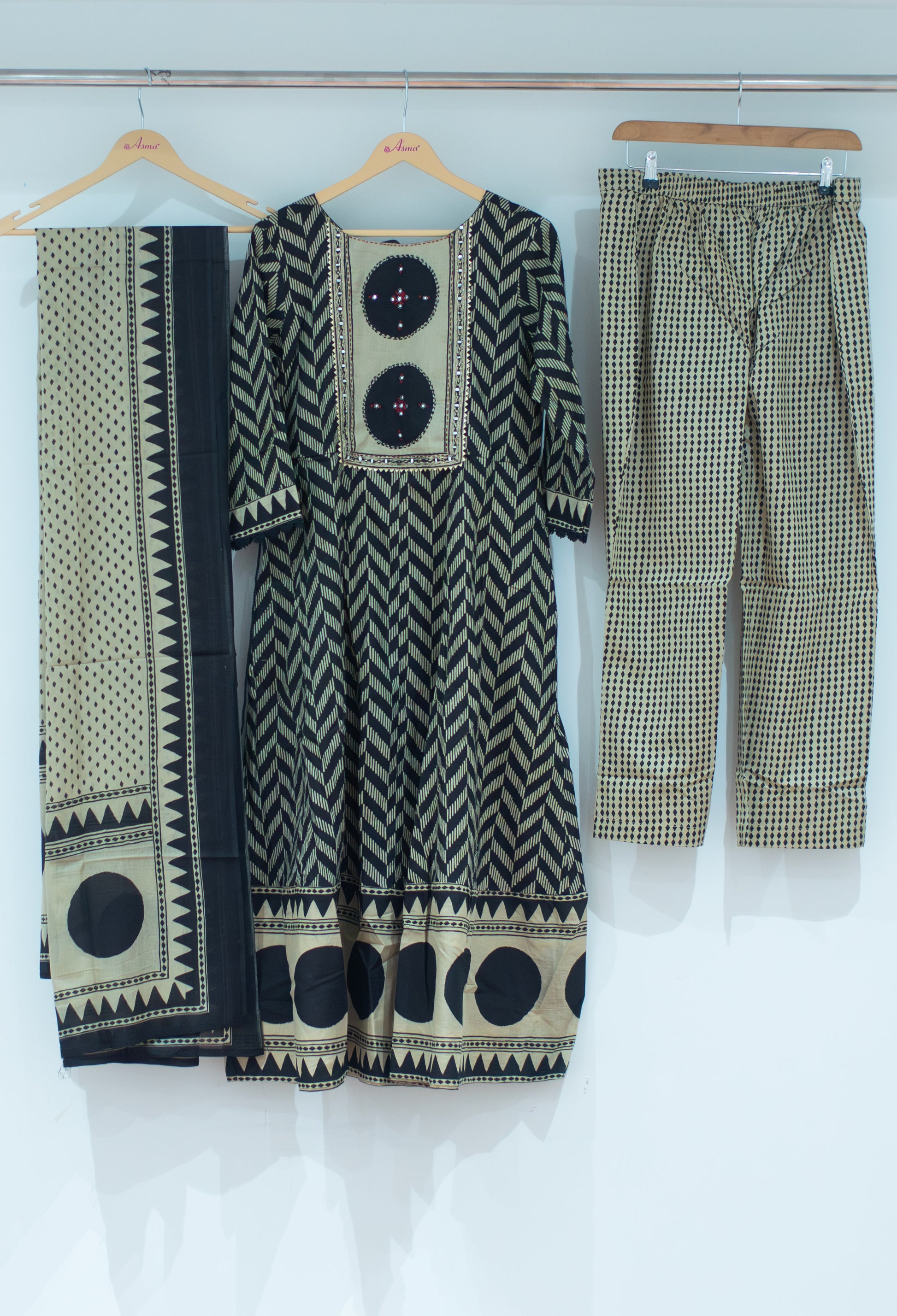 Make a bold ethnic statement with this stylish Black & Beige Printed Kurta Pant Set with Dupatta. Featuring striking geometric and traditional motifs, the kurta is designed with a beautifully detailed yoke highlighted by decorative accents that add a handcrafted, artisanal touch.