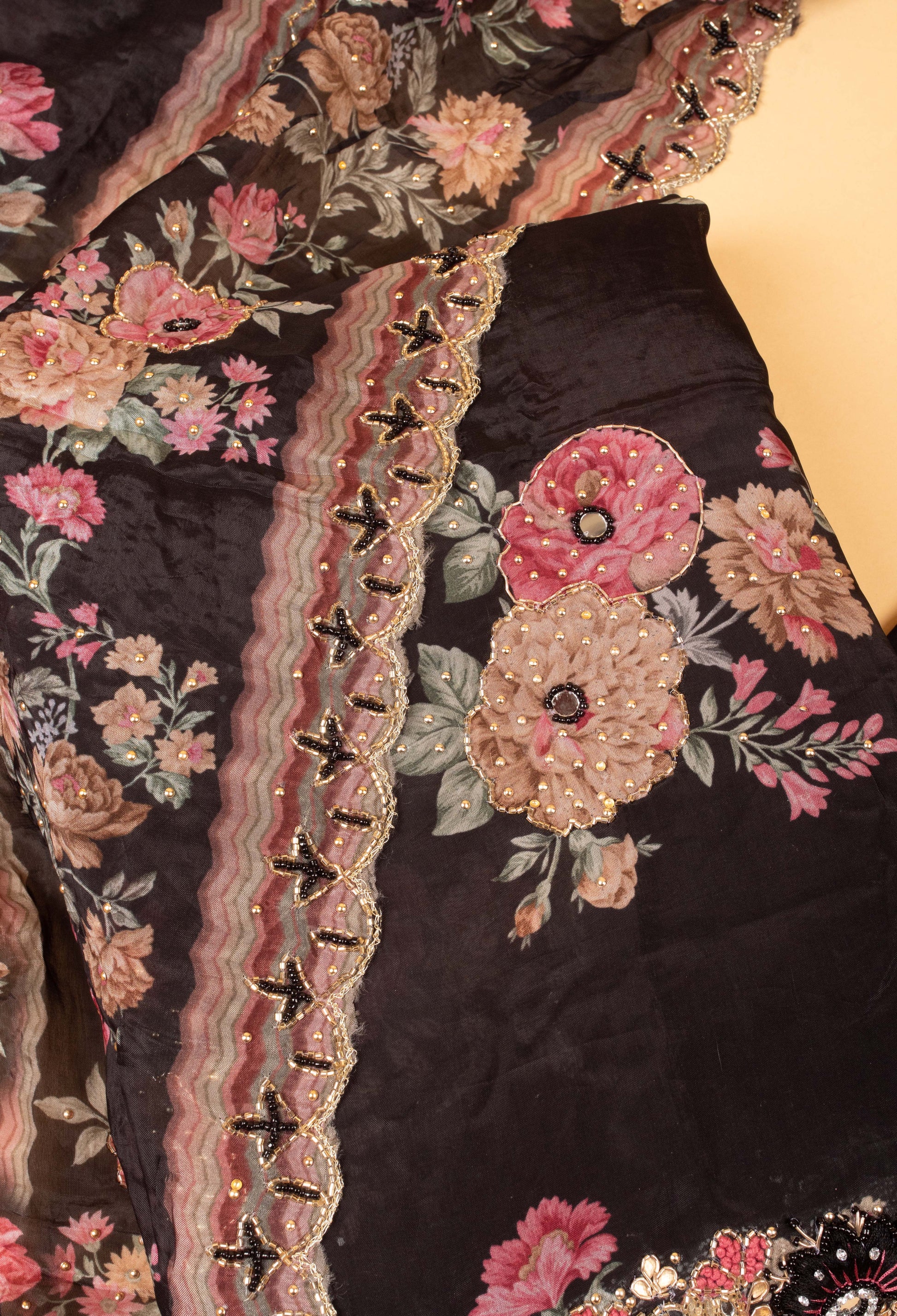 Enhance your ethnic collection with this elegant Black Floral Embroidered Unstitched Dress Material, crafted for timeless style and versatility. Featuring a rich black base adorned with delicate floral prints and intricate embroidery, this dress material exudes refined charm. The beautifully embellished borders and subtle sequin highlights add a festive touch, making it ideal for custom tailoring into a salwar suit or ethnic ensemble. Perfect for celebrations, evening wear, and festive occasions, this unstitched set allows you to design a silhouette that suits your personal style.
