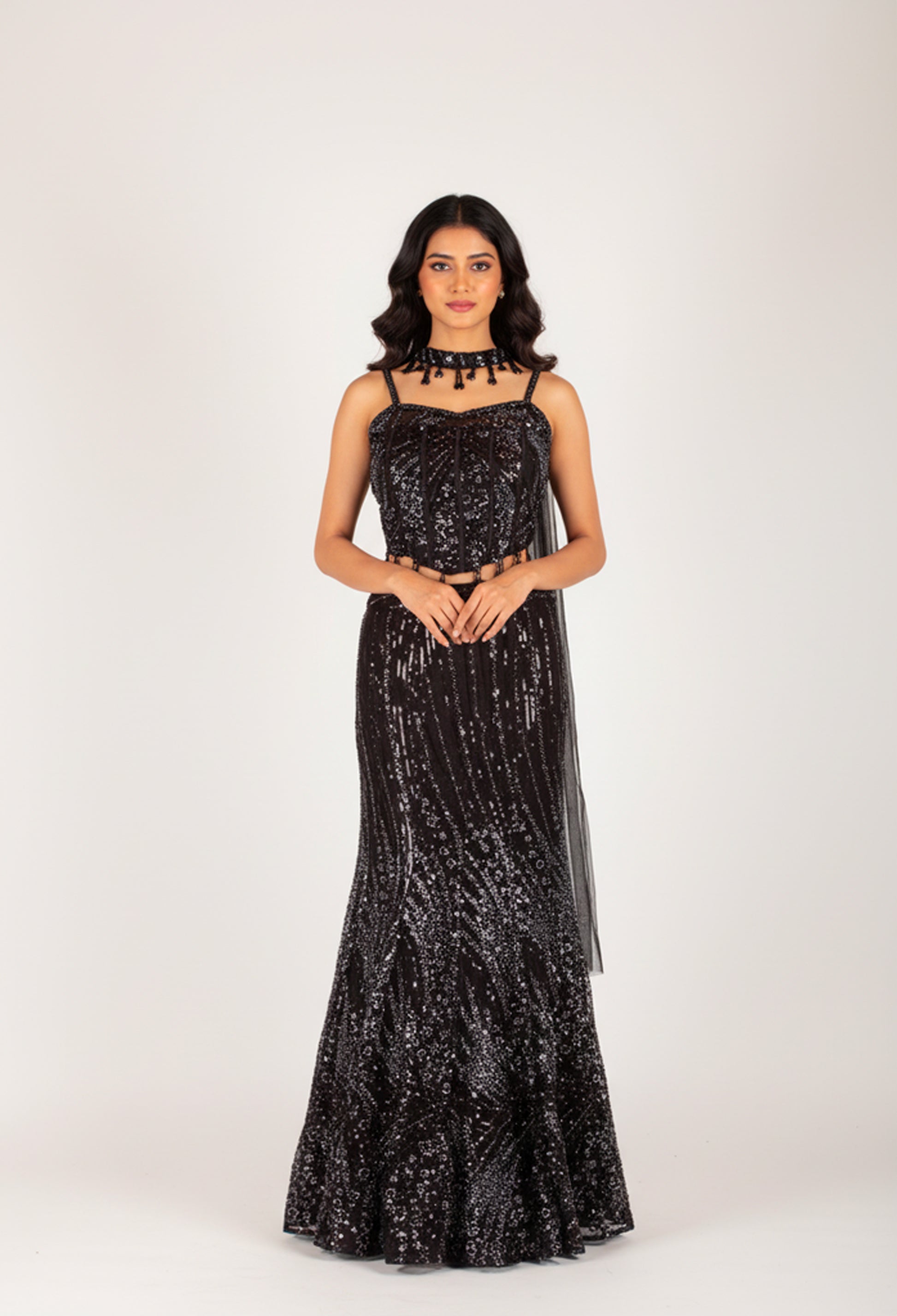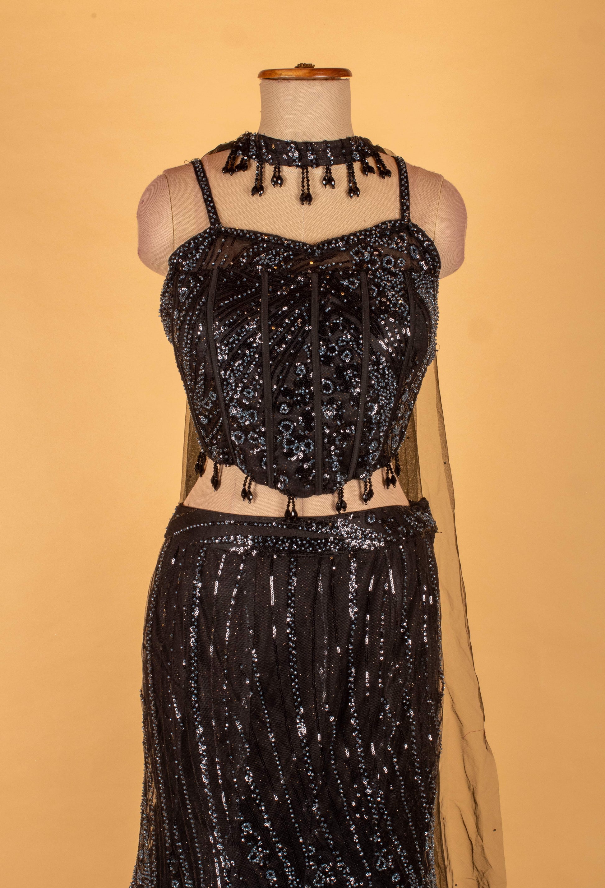 Make a glamorous entrance at your next celebration with this luxurious Black Designer Lehenga Set. Crafted with heavy sequin embellishments throughout, this outfit sparkles beautifully under every light — giving you that red-carpet-ready glow.