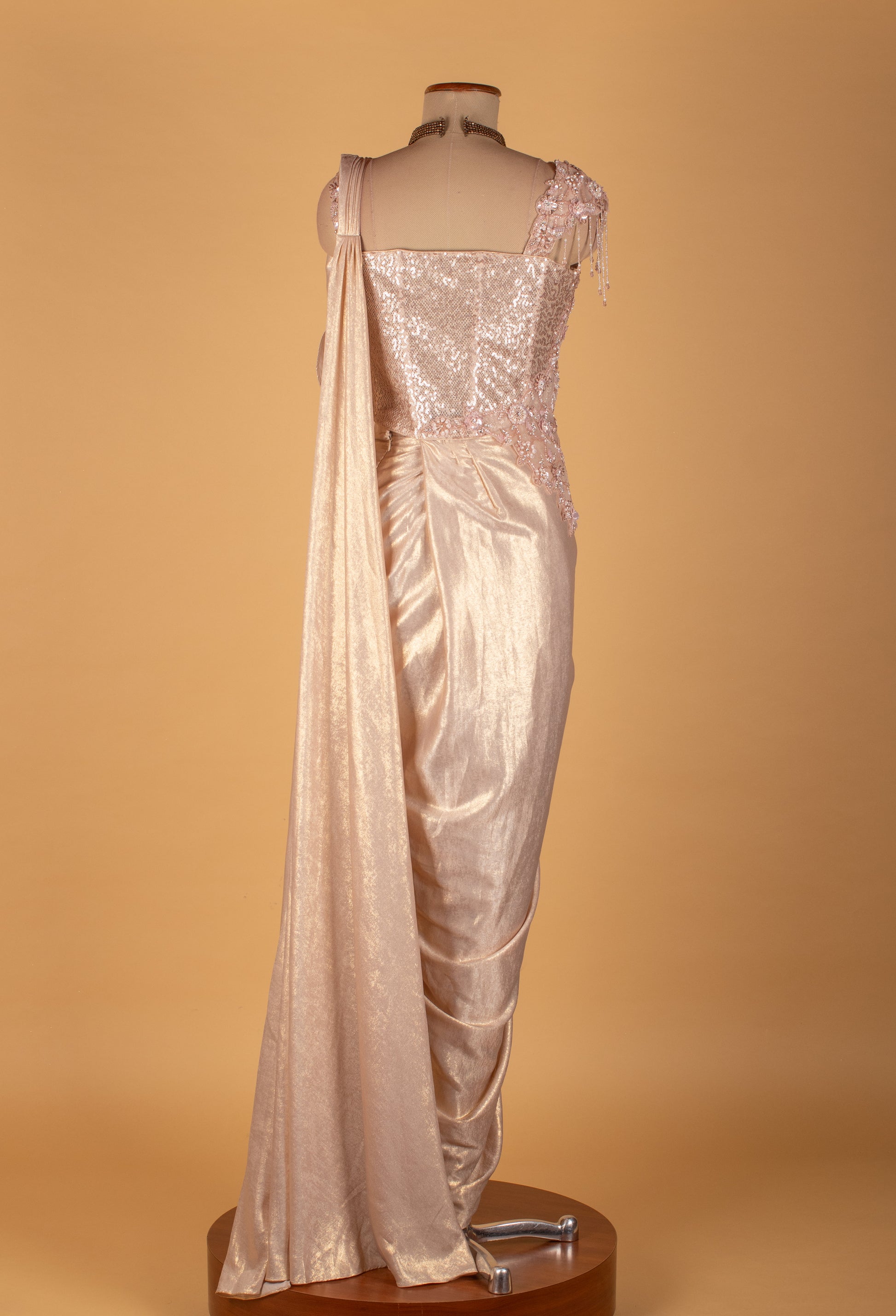 The draped saree has a graceful flow with soft folds and an elegant layered fall, creating a flattering silhouette perfect for high-fashion events. This ensemble is ideal for receptions, engagement parties, cocktail nights, and modern festive celebrations.