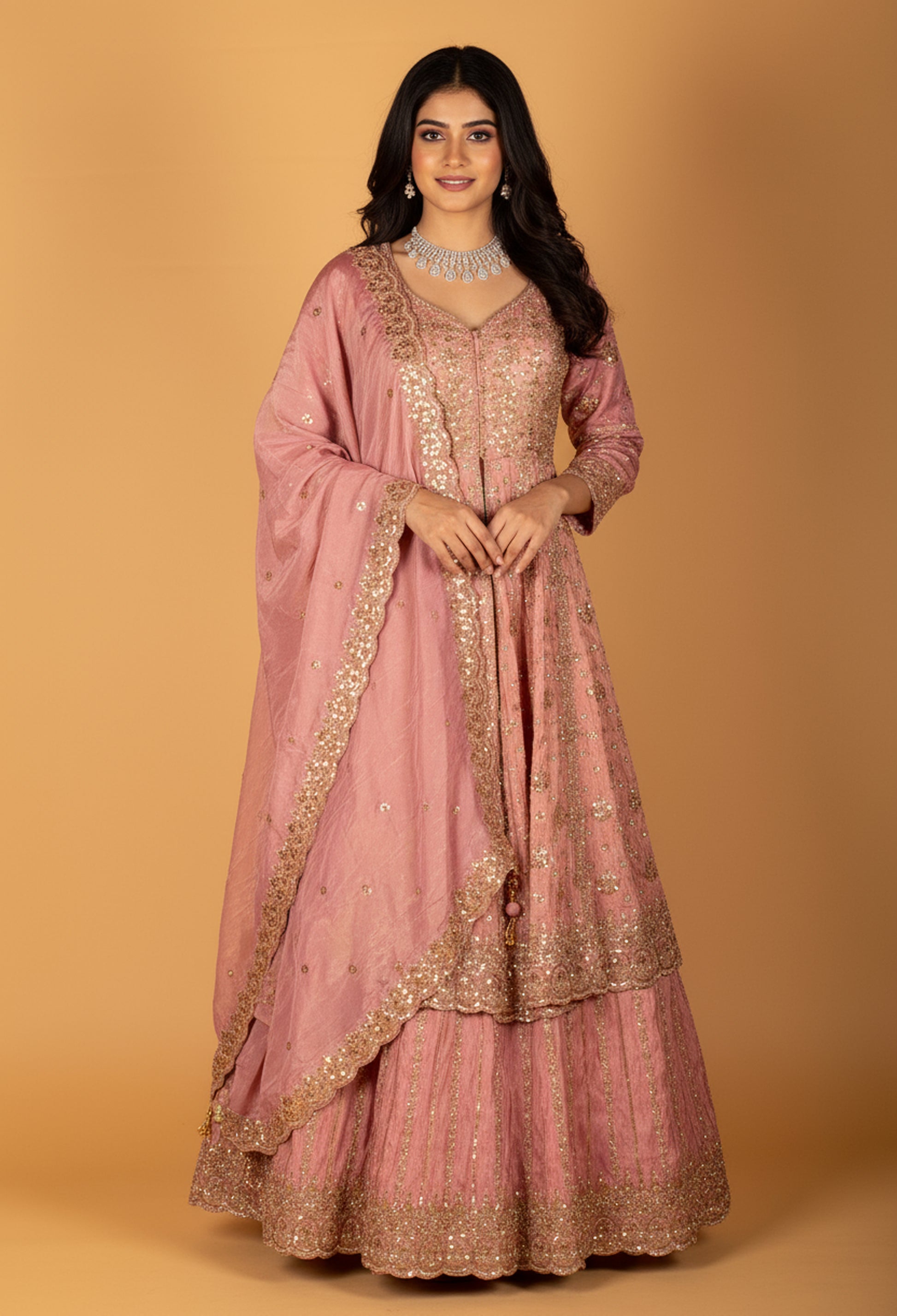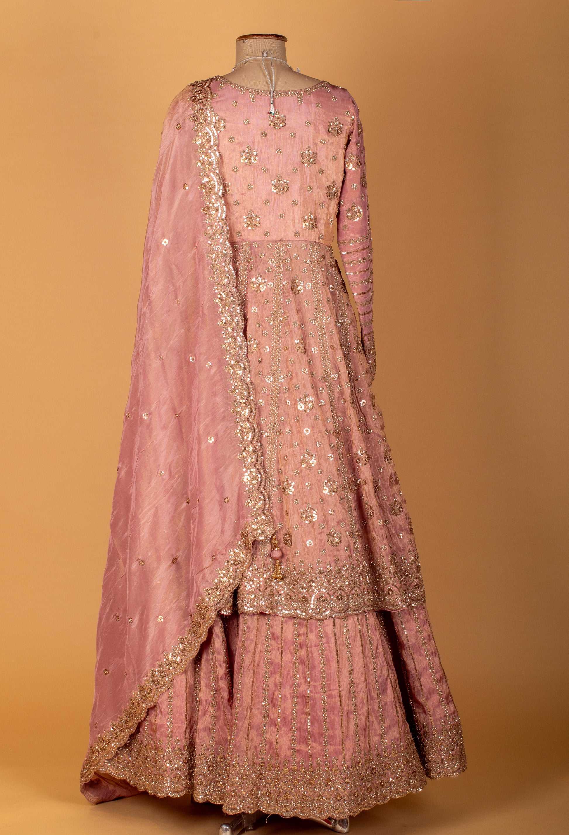Elevate your festive wardrobe with Asma’s blush pink embroidered crop top lehenga set, a masterpiece that beautifully blends modern elegance with traditional charm.