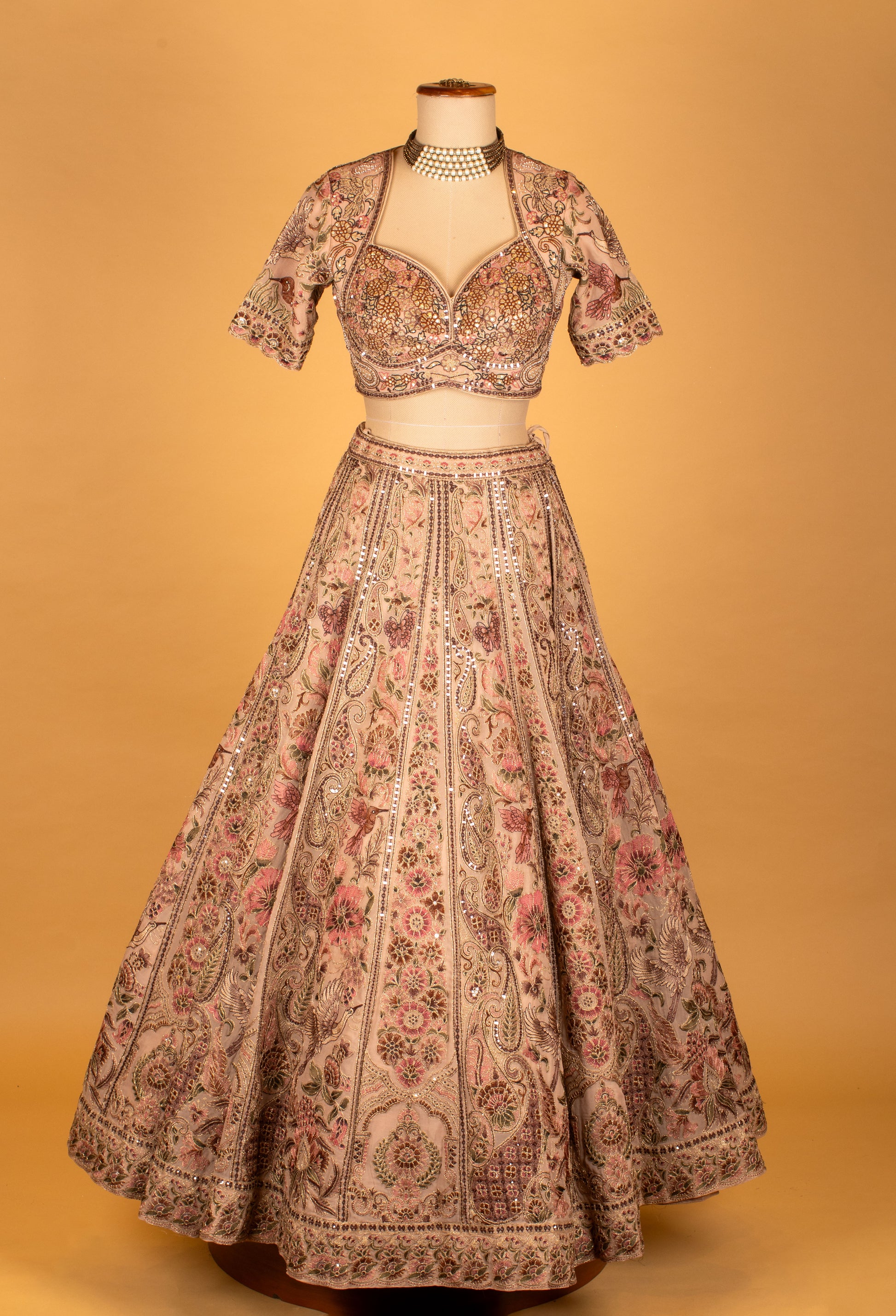 Step into elegance with this exquisite blush-pink lehenga set, a true masterpiece of intricate craftsmanship. The outfit features a heavily embellished blouse with multicolor floral embroidery, delicate threadwork, and shimmering sequin highlights that create a luxurious mosaic effect.