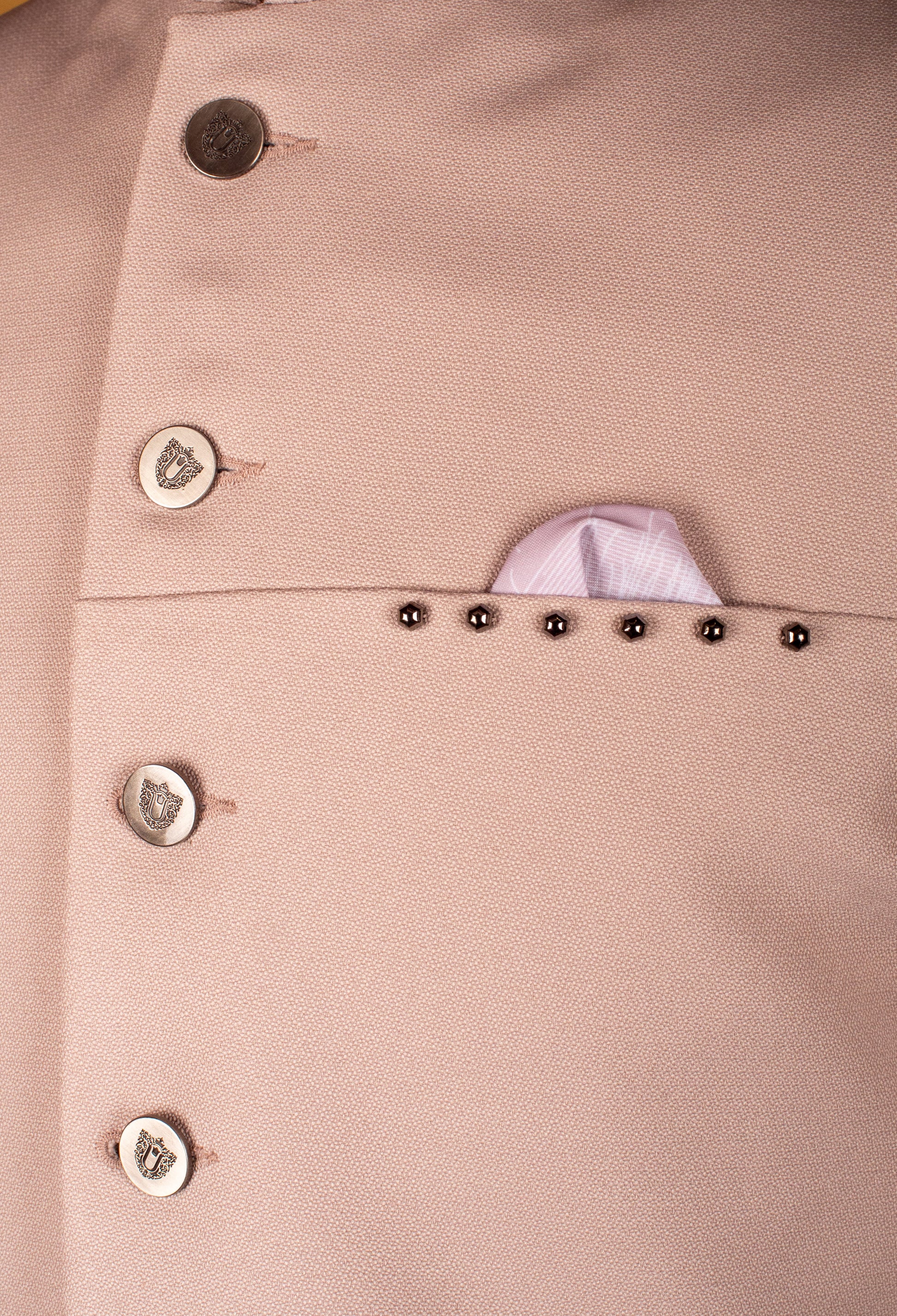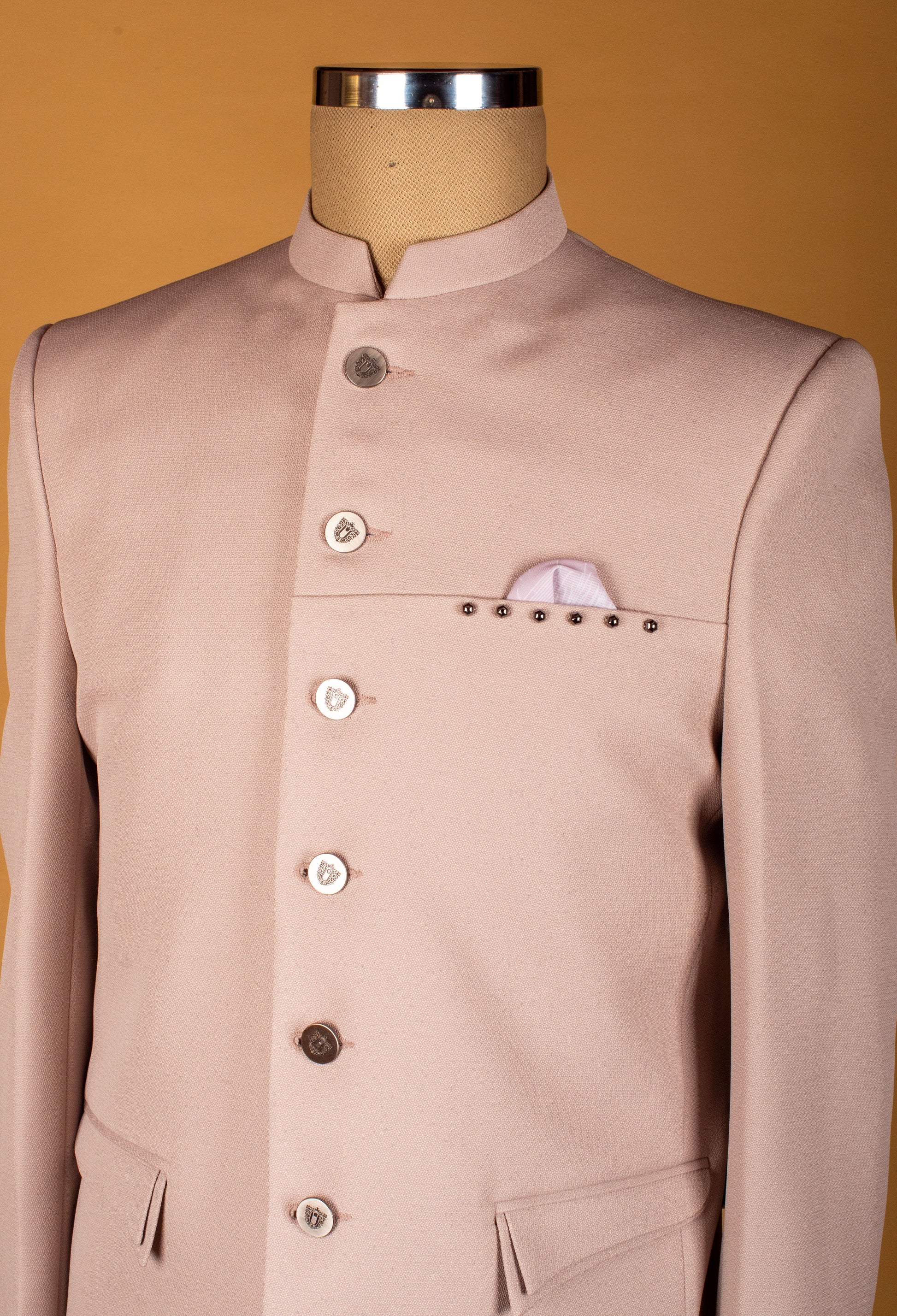 Tailored from premium suiting fabric, the design features a structured silhouette enhanced by clean lines and a minimal studded pocket detail for a touch of contemporary charm. The Mandarin collar and matte finish buttons lend this piece an air of quiet confidence, while the soft blush tone adds a sense of warmth and sophistication — perfect for day weddings, festive occasions, or formal celebrations.