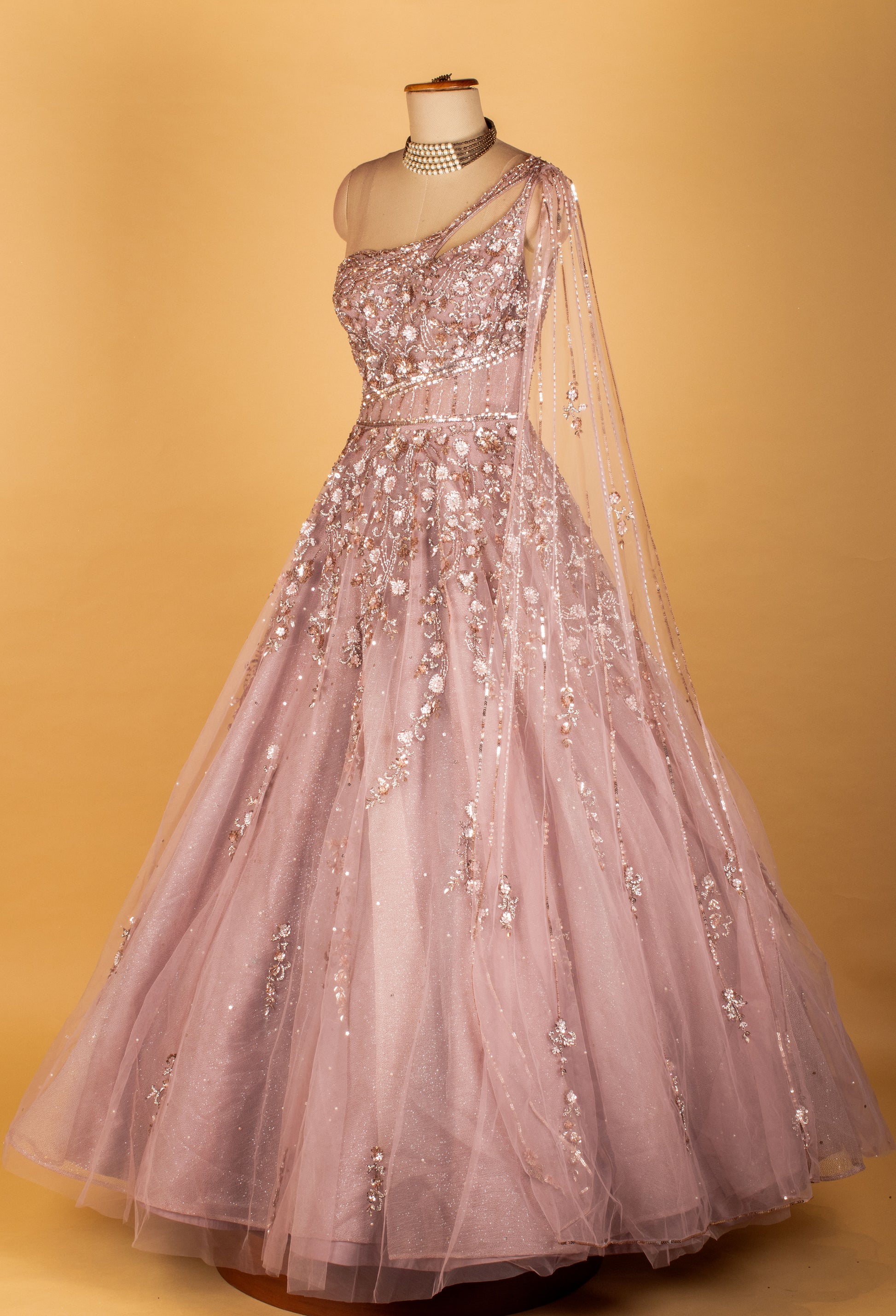 Step into effortless elegance with this enchanting blush pink embellished one-shoulder gown, designed to make a refined statement at special occasions. The asymmetrical one-shoulder bodice is beautifully adorned with delicate floral embroidery, sequin accents, and fine bead detailing, creating a graceful yet contemporary appeal.