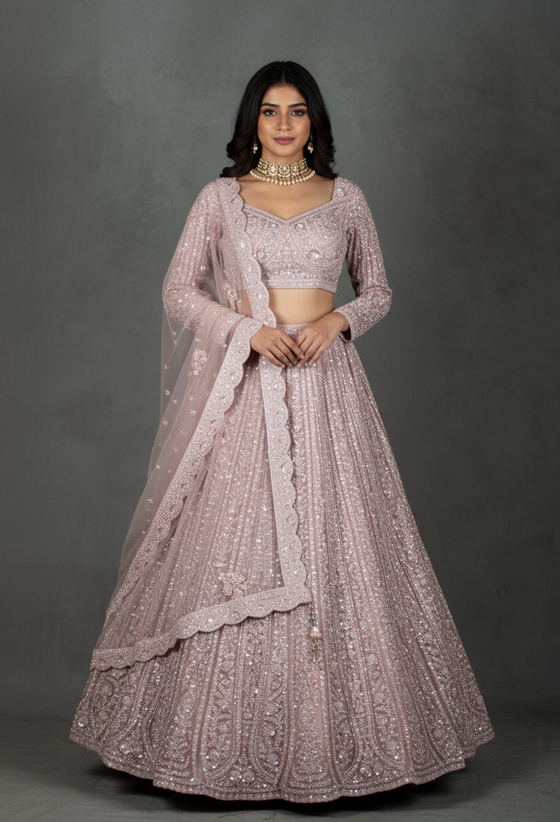 - Lehenga: Flared silhouette with dense sequin work and scalloped border