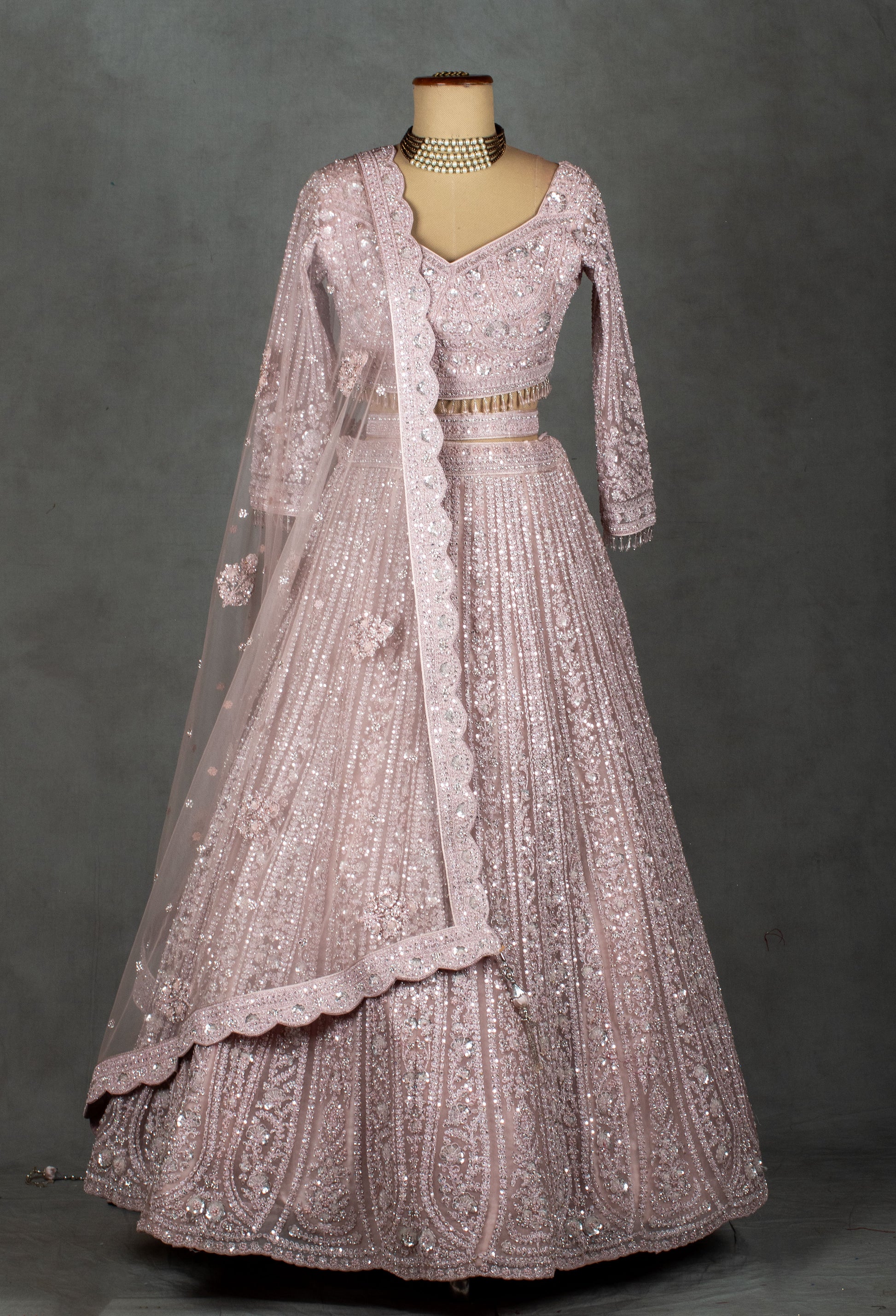 The voluminous lehenga skirt shimmers with intricate handwork — detailed floral and linear patterns brought to life through shimmering sequins and soft tonal embroidery. The subtle pastel pink hue enhances its ethereal charm, making it perfect for modern brides or bridesmaids who prefer understated opulence.