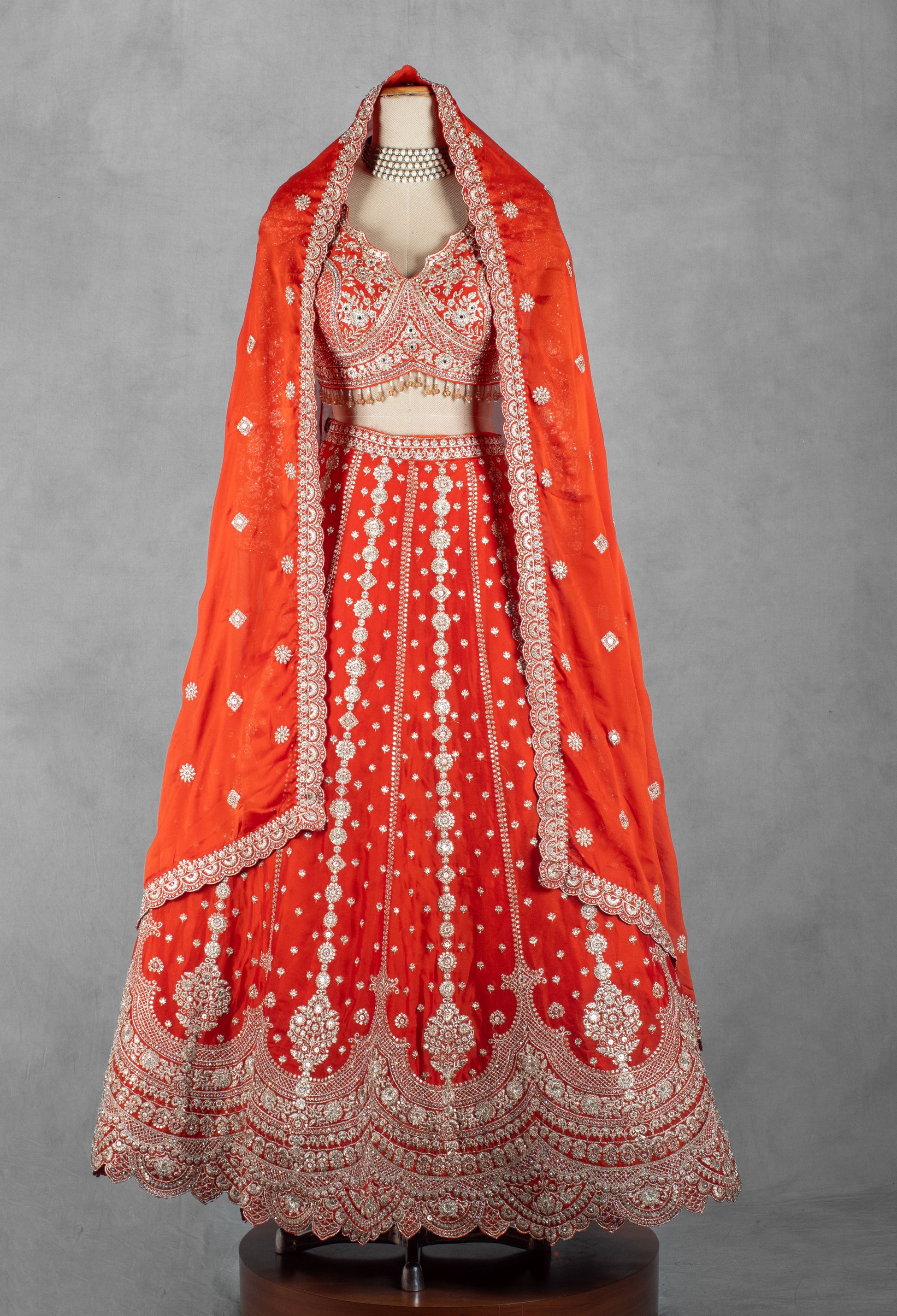 Turn every head with this Bright Orange Heavy Embroidered Bridal Lehenga Set, crafted with exceptional detail and vibrant elegance. The lehenga showcases rich threadwork, intricate zari embroidery, sequin embellishments, and scalloped borders, creating a luxurious masterpiece perfect for brides and grand festive occasions. The vertical embroidered motifs add length and grace to the silhouette, while the ornate hemline offers dramatic grandeur.