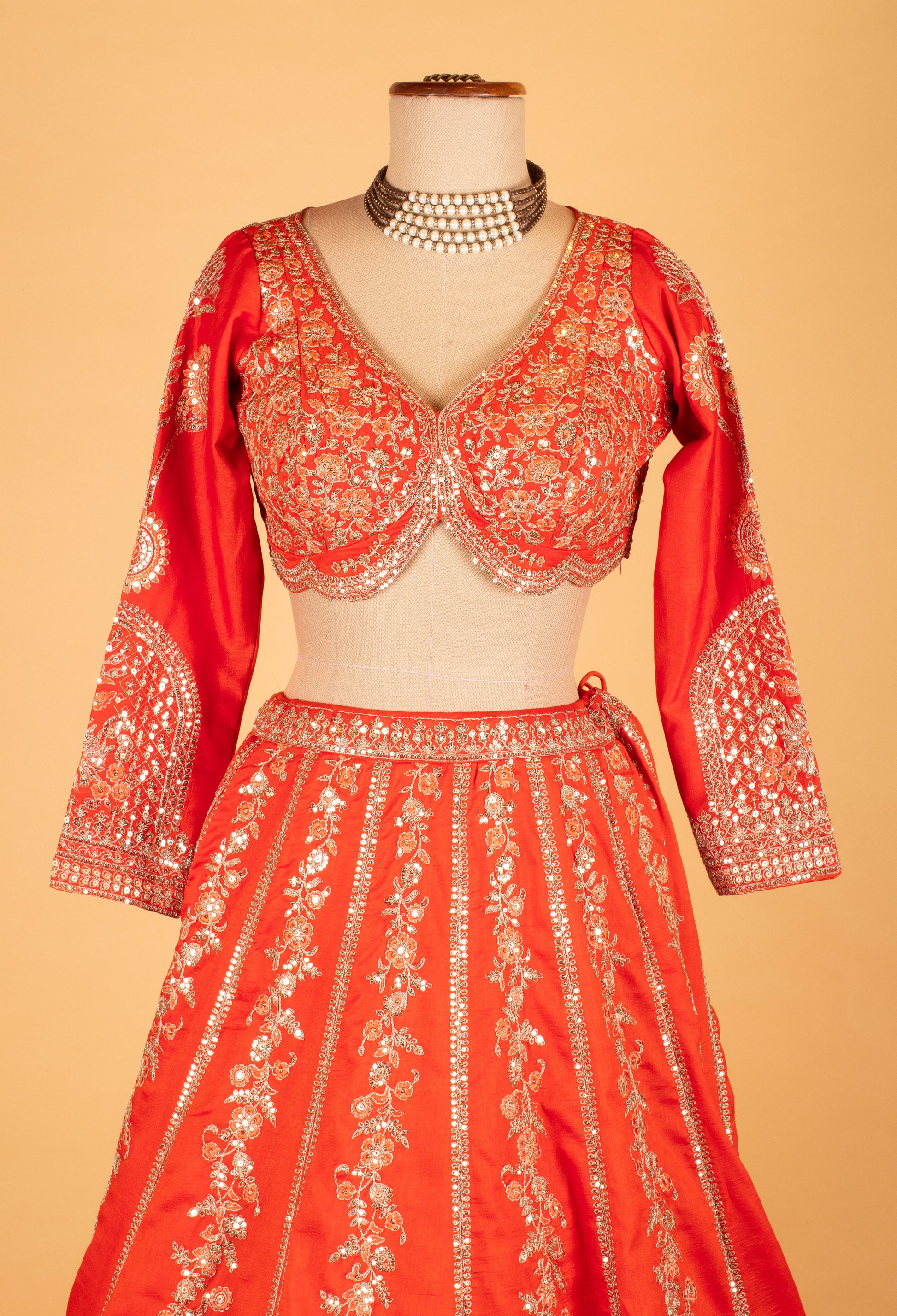 Make a bold and beautiful statement with this stunning Bright Orange Crop Top Lehenga Set — a perfect blend of tradition, modern flair, and festive glamour. Designed with rich metallic embroidery, dazzling mirror work, and detailed floral patterns, this ensemble radiates celebration with every shimmer.