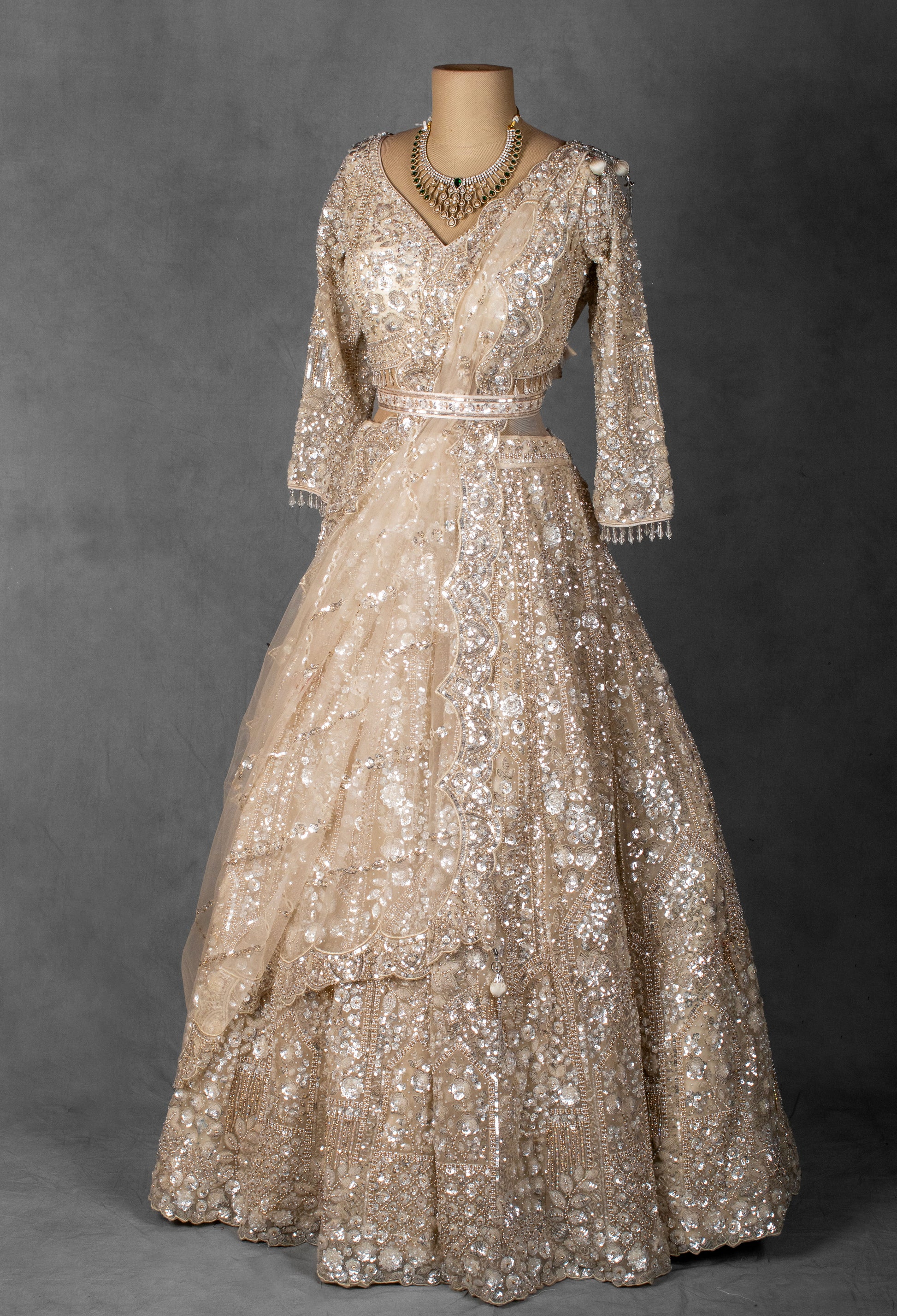 Radiate elegance in this champagne gold lehenga, richly adorned with sequins, beads, and intricate thread embroidery. The beautifully crafted blouse with 3/4th sleeves and delicate tassel details pairs gracefully with the voluminous skirt, featuring a stunning mix of floral and geometric motifs. The sheer dupatta with scalloped embroidery enhances the ethereal charm of this couture ensemble.