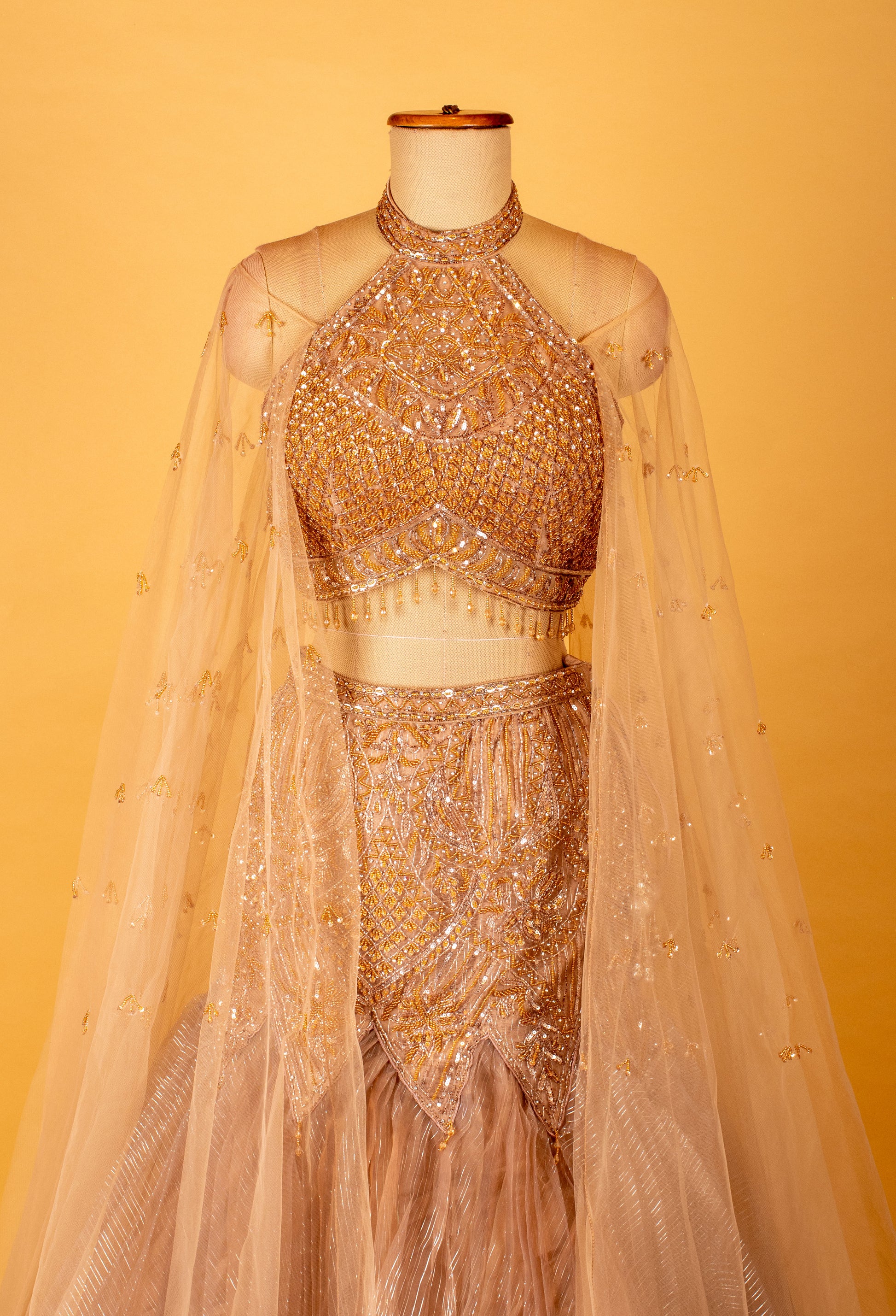 Champagne gold crop top lehenga set with sheer cape