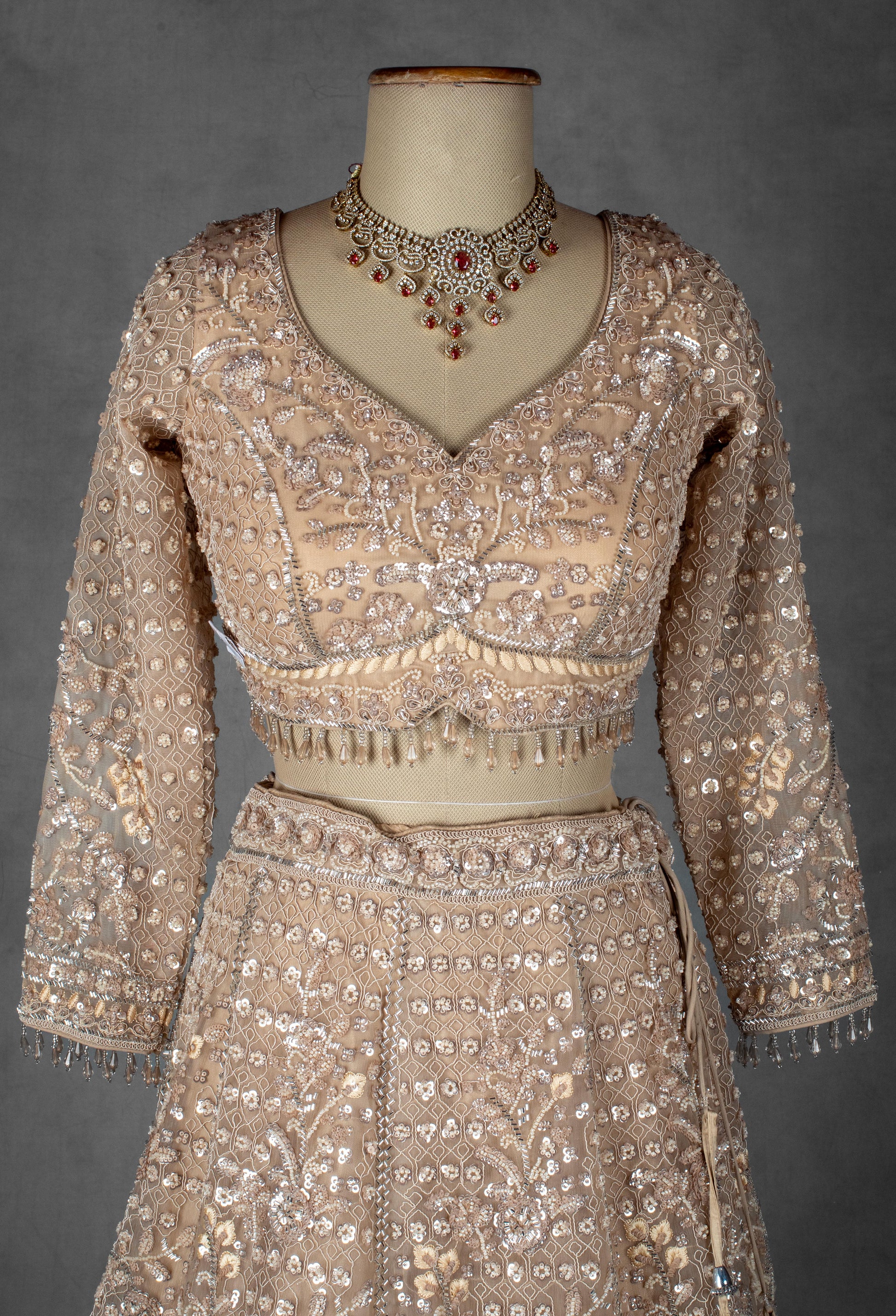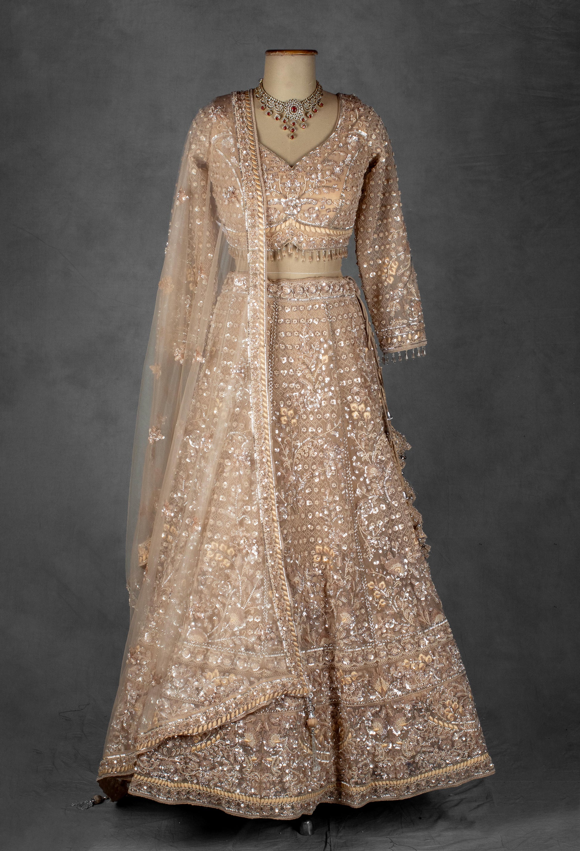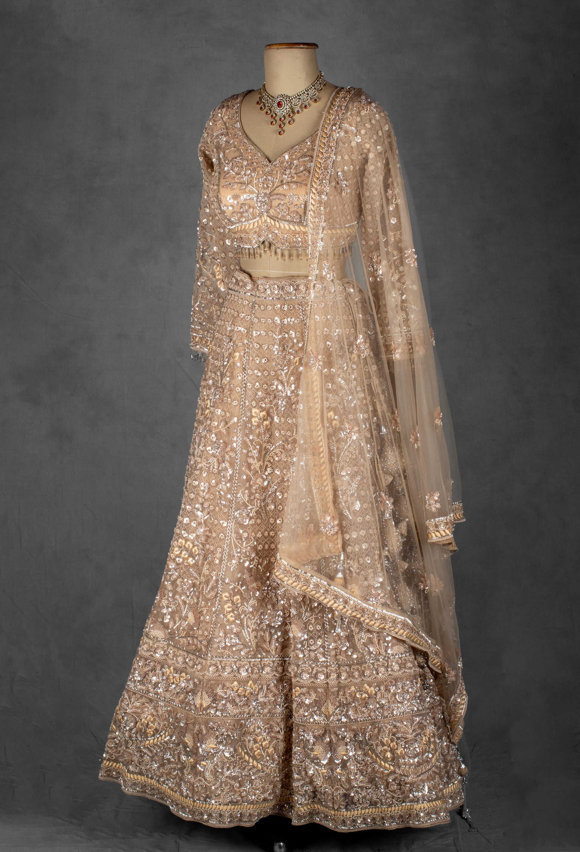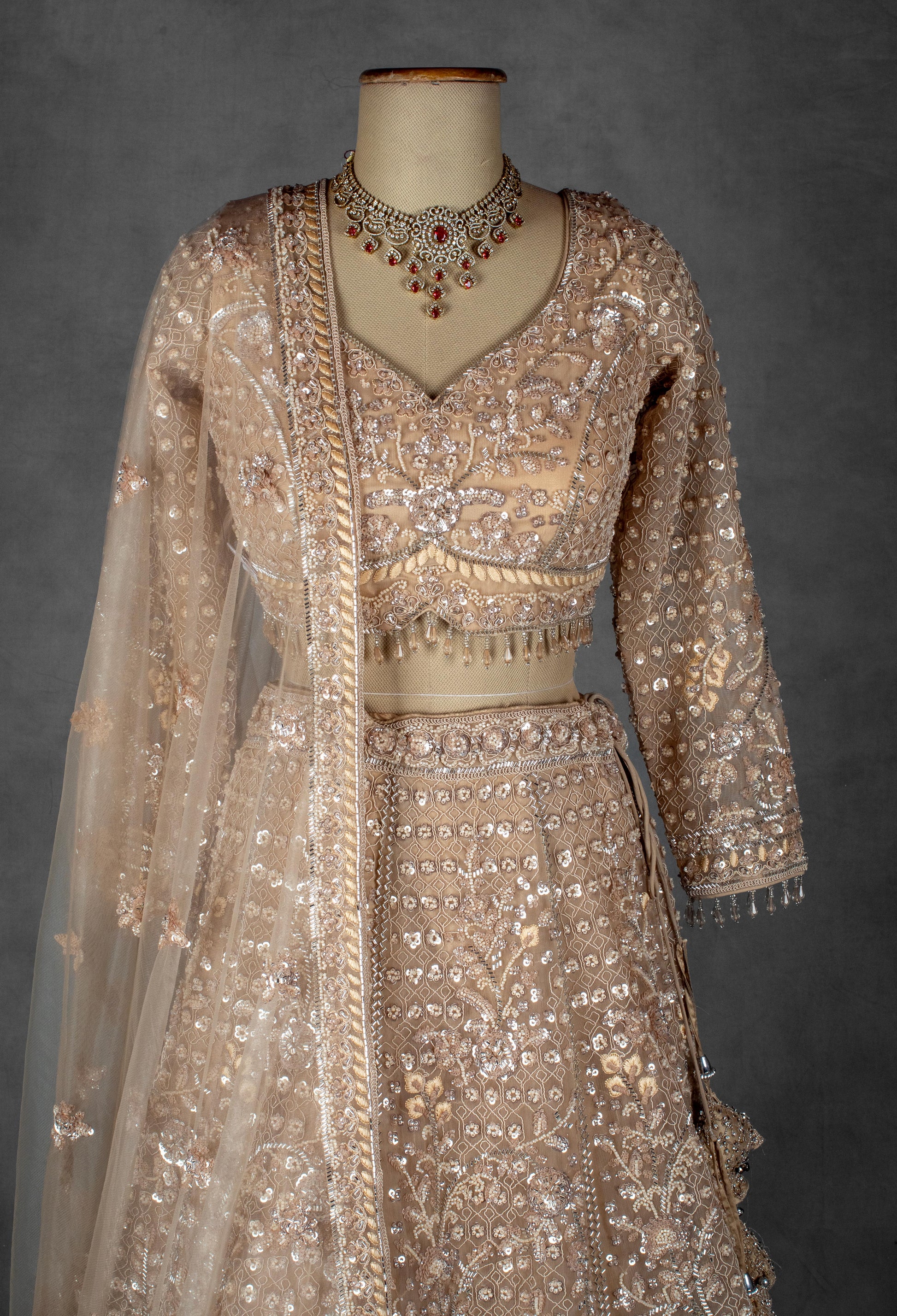 Radiate elegance and sophistication in this champagne gold sequin lehenga set, a perfect choice for modern brides and bridesmaids who appreciate subtle luxury. The ensemble features an intricately embroidered lehenga, adorned with shimmering sequins, threadwork, and delicate floral patterns that give it a regal charm.