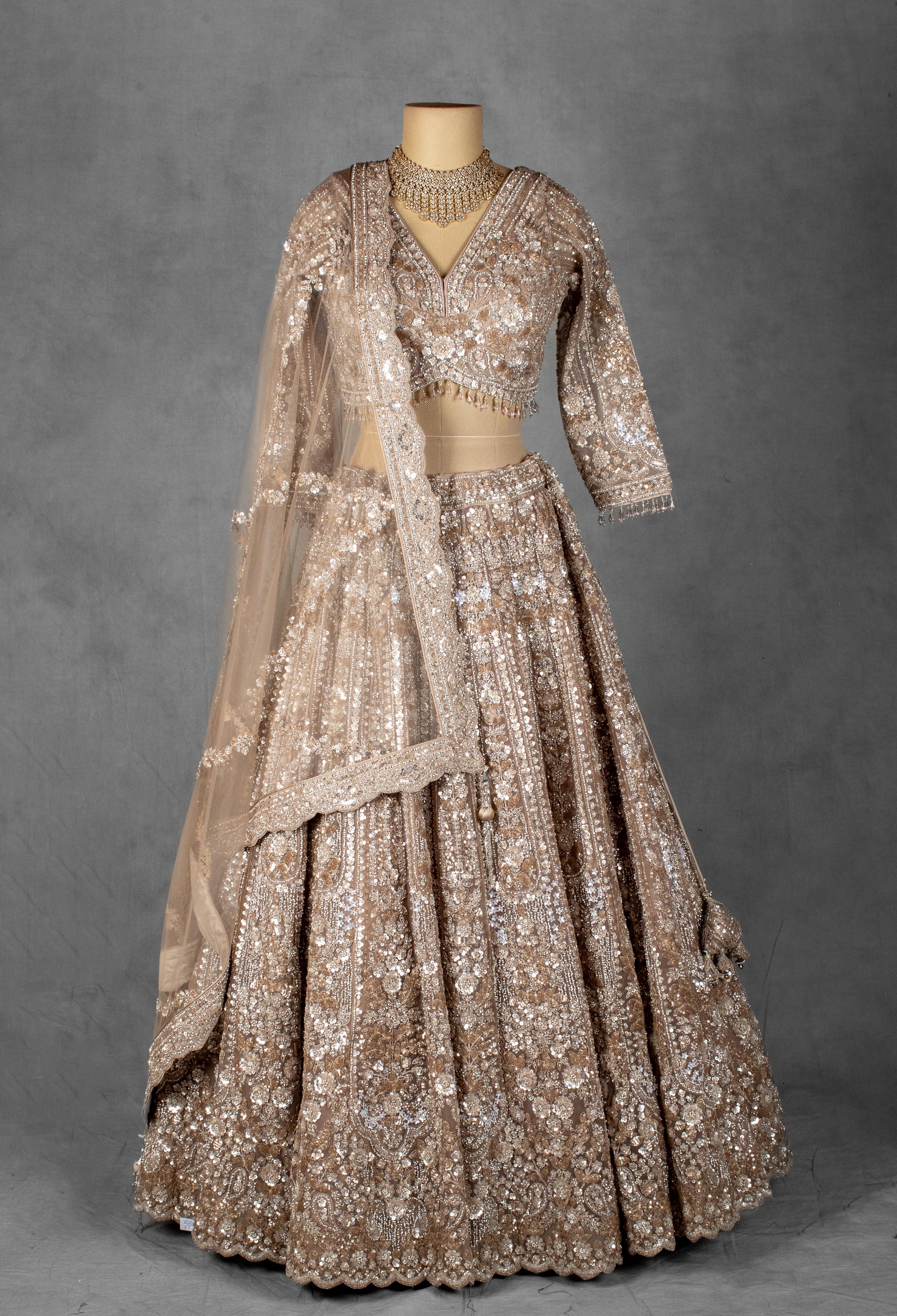 The set includes a richly detailed full-flare lehenga skirt, a matching V-neck blouse (choli) with three-quarter sleeves, and a net dupatta adorned with delicate embroidery and scalloped borders. The champagne gold hue, accentuated by shimmering embellishments, adds a regal touch that captures the essence of modern bridal fashion.