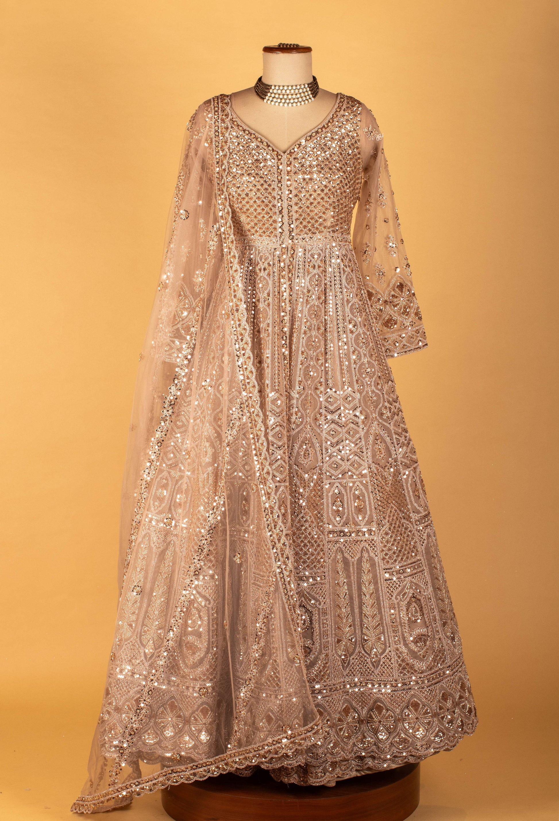 Elevate your festive and bridal wardrobe with this exquisite blush pink heavy embroidered Anarkali gown, crafted to make every moment unforgettable. Designed on a delicate sheer net base, the gown features intricate sequin, zari, and thread embroidery that creates a luxurious all-over shimmer. The V-neckline, full embellished sleeves, and flowing flare enhance its regal charm, while the beautifully detailed dupatta completes the ensemble with grace.
