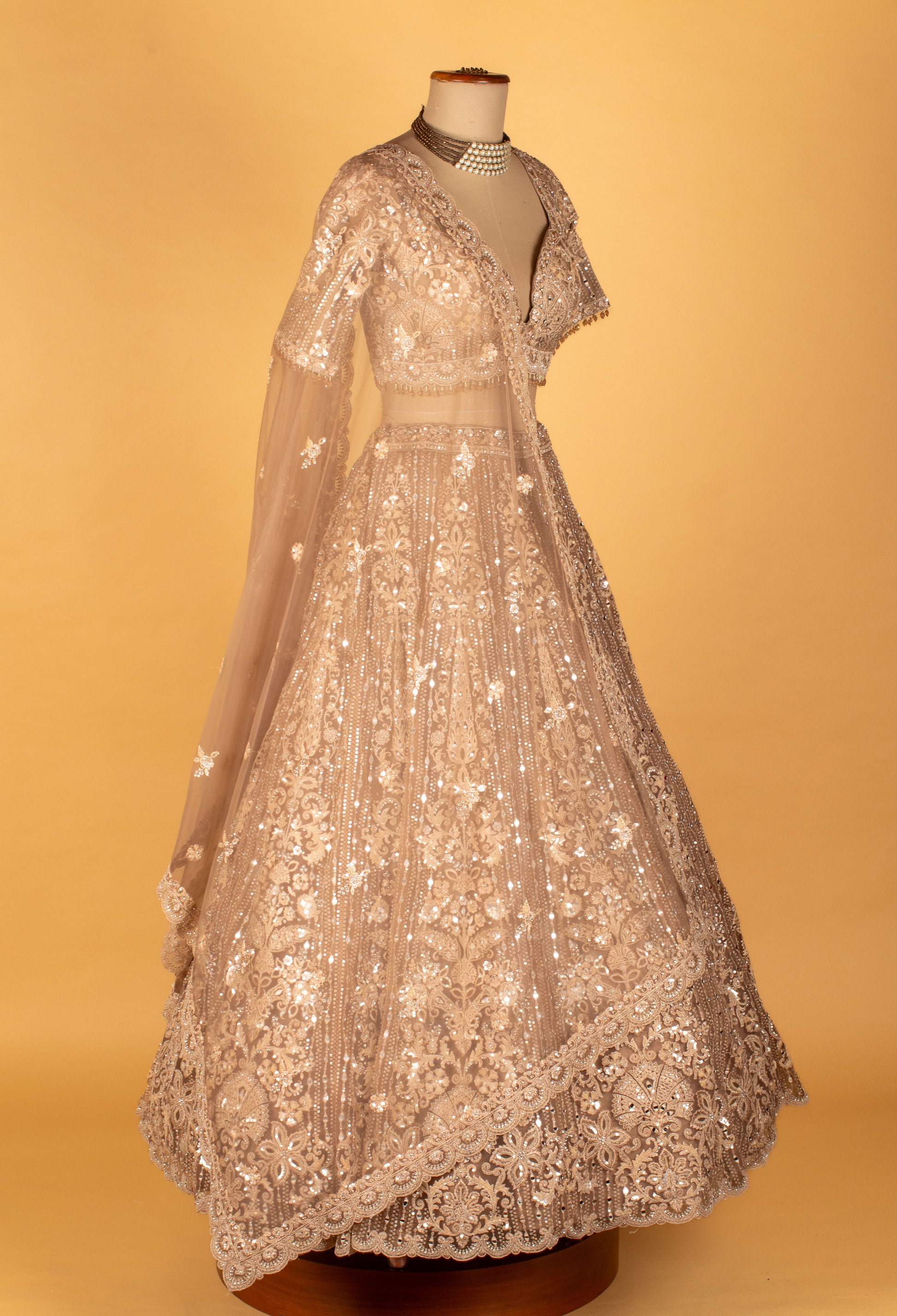 A soft-net dupatta completes the ensemble, embellished with scattered floral butti work and a scalloped embroidered border that enhances its grace. This champagne lehenga is the perfect choice for receptions, sangeet functions, engagements, and luxury festive occasions.