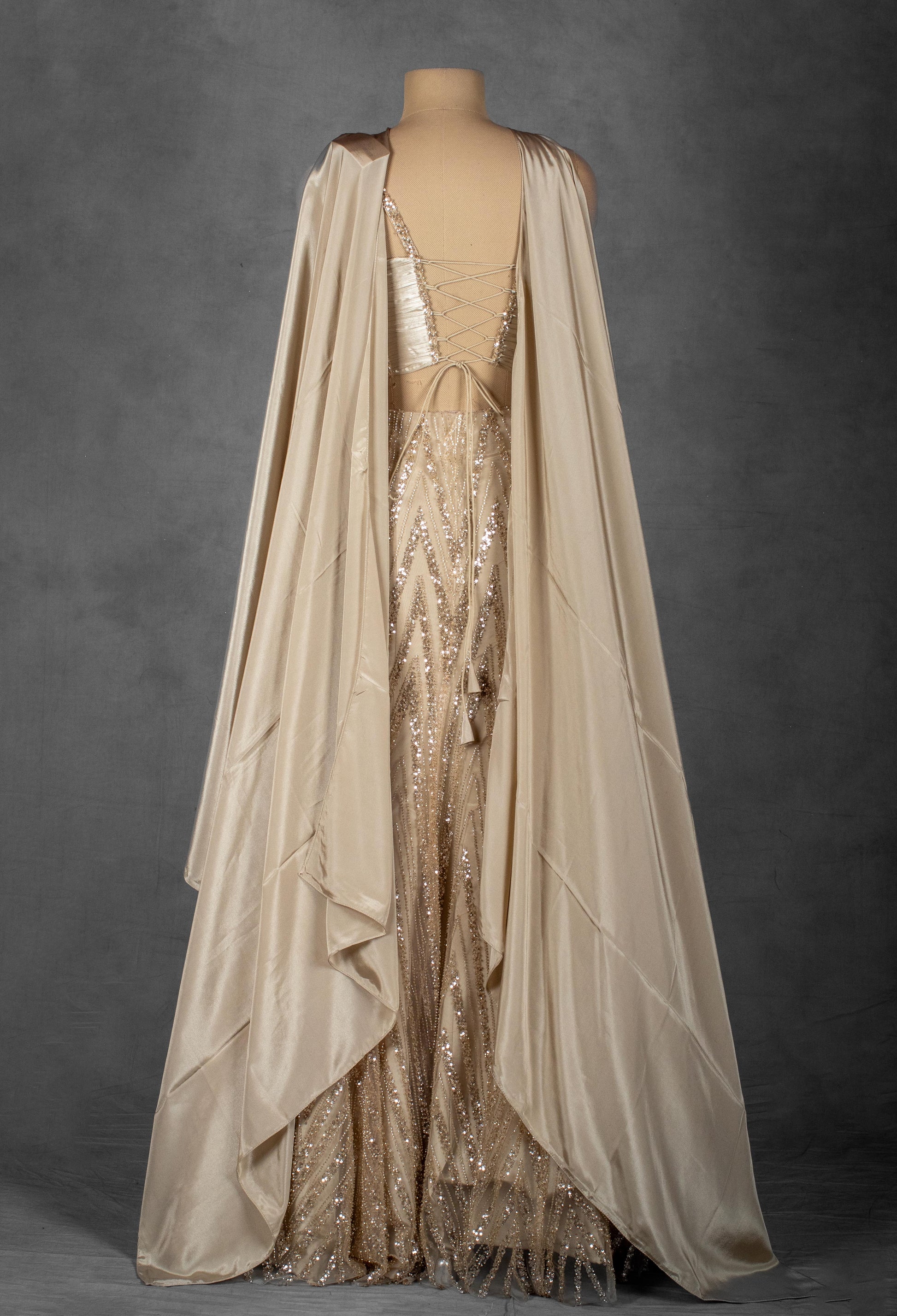 A statement cape-style dupatta drapes beautifully over the shoulders, adding a touch of regal drama to the ensemble — making it a true standout for receptions, cocktail nights, and red-carpet occasion
