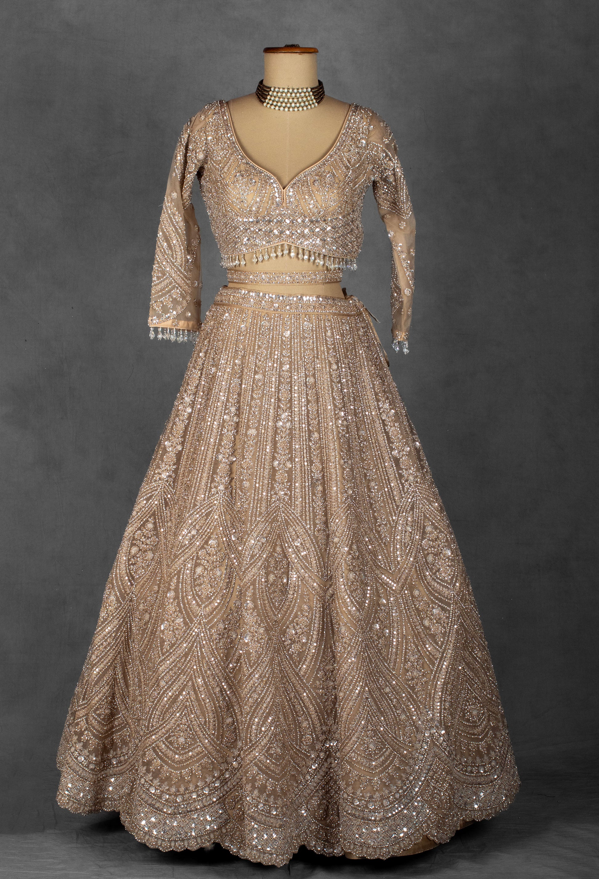 Step into a world of opulent grace with this Champagne Gold Sequin Embroidered Lehenga by Asma, designed to embody modern royalty and luminous charm.