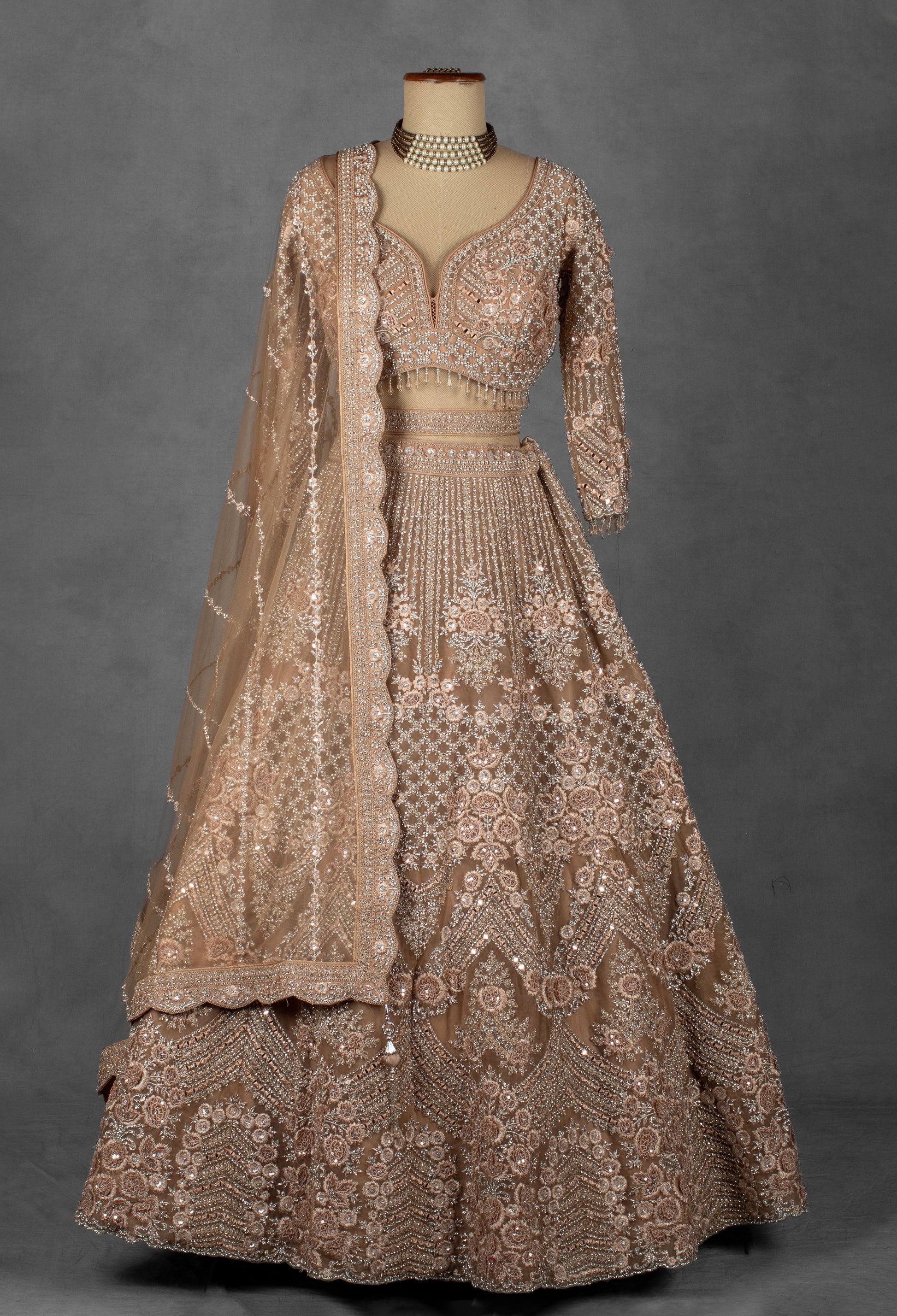Ethereal and timeless, this champagne nude hand-embroidered crop top lehenga set is a symphony of elegance and refined craftsmanship. The deep sweetheart neckline blouse, beautifully adorned with intricate sequin, pearl, and thread embroidery, radiates understated luxury with every shimmering detail.