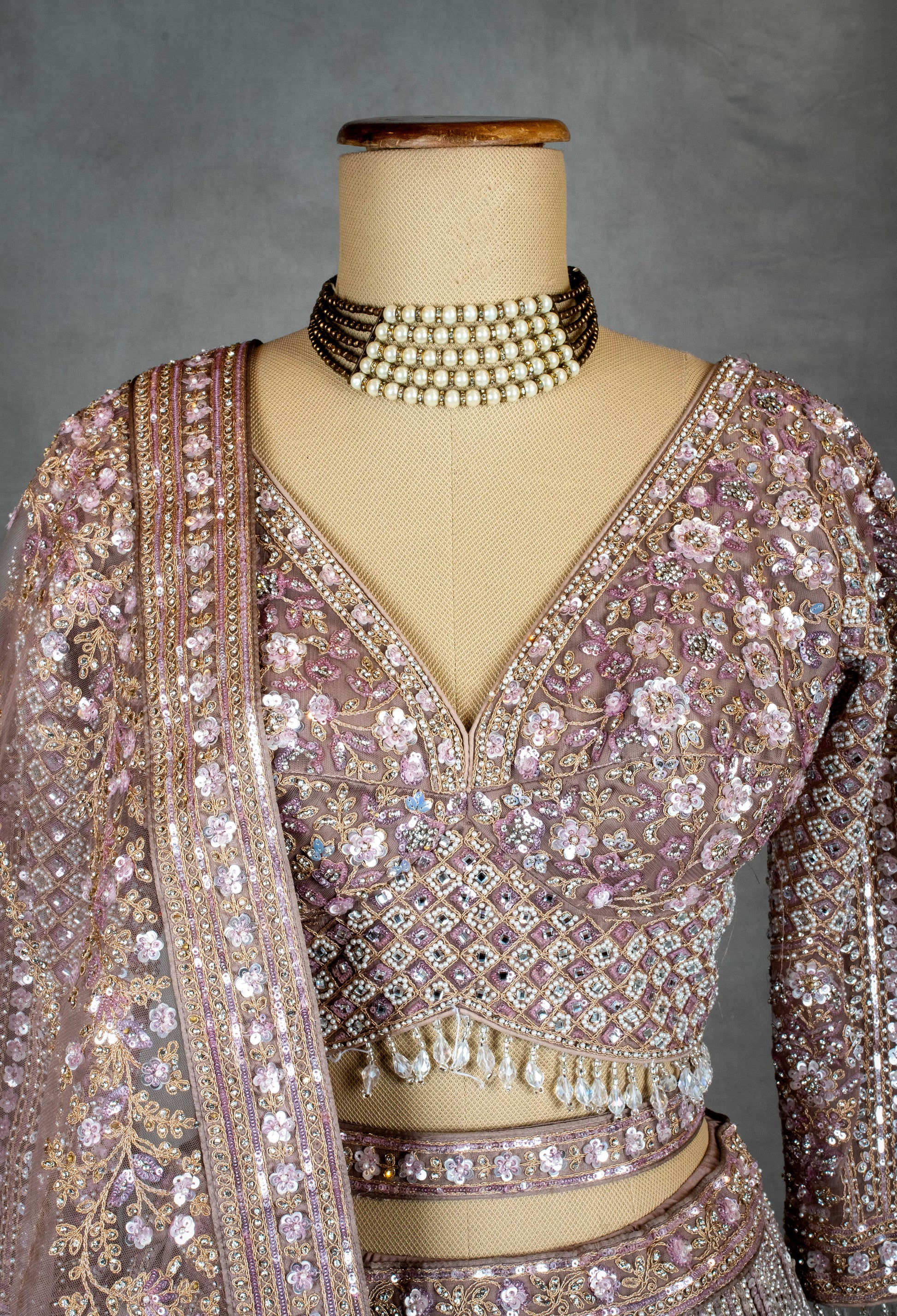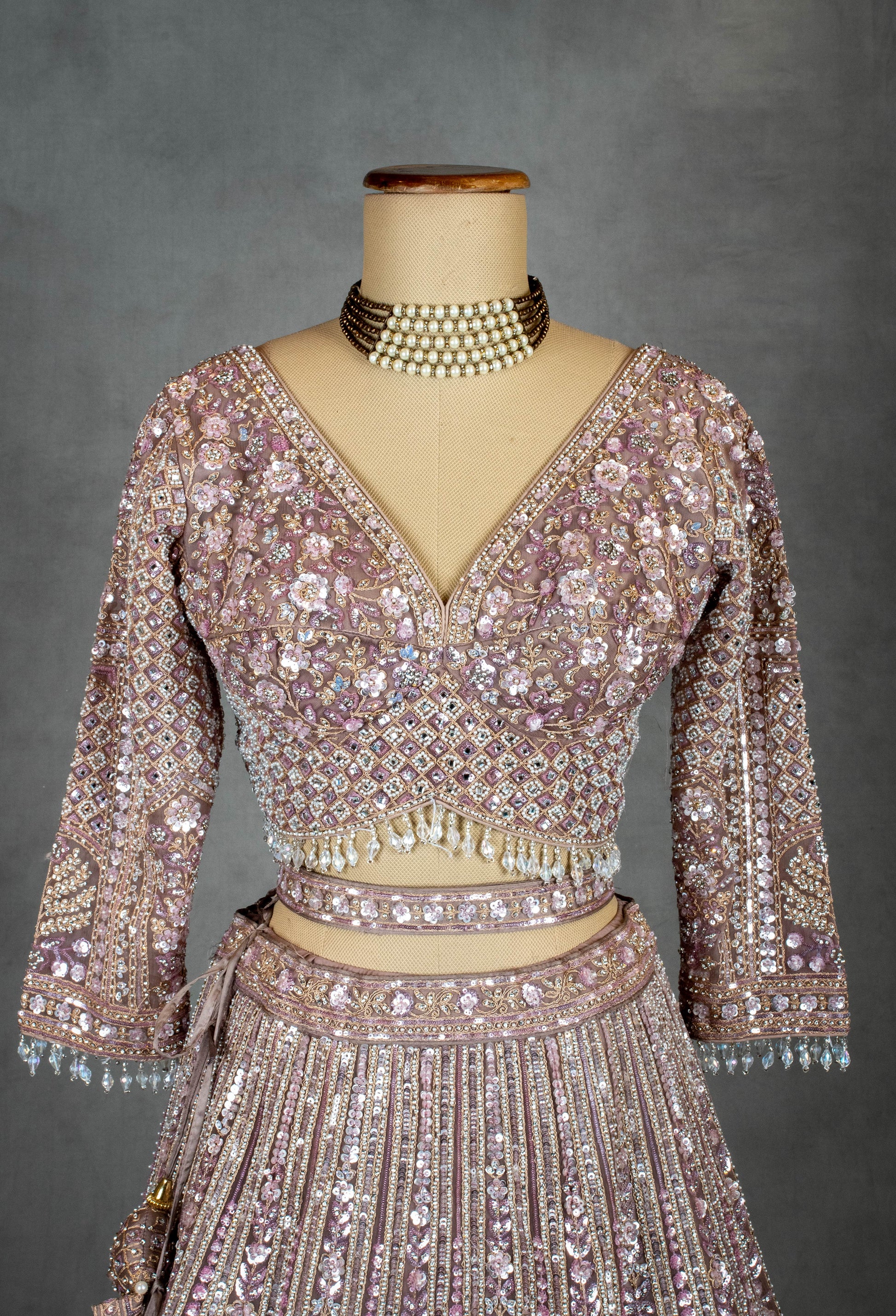 Grace meets grandeur in this Dusty Mauve Embroidered Lehenga Set, a sophisticated blend of pastel elegance and intricate craftsmanship. Drenched in shimmering mirror work, sequin detailing, and thread embroidery, this outfit is designed for the bride or bridesmaid who loves understated luxury.