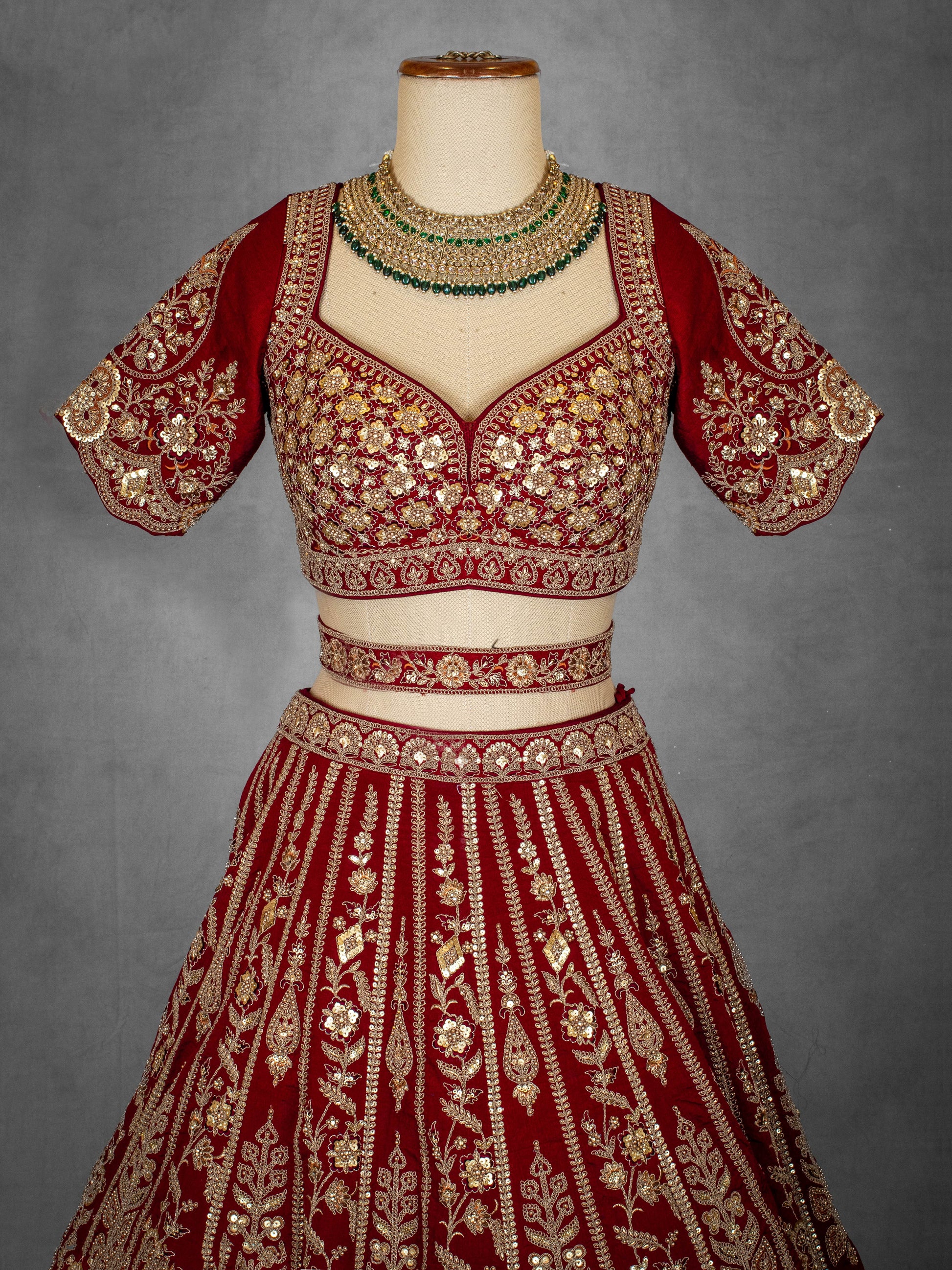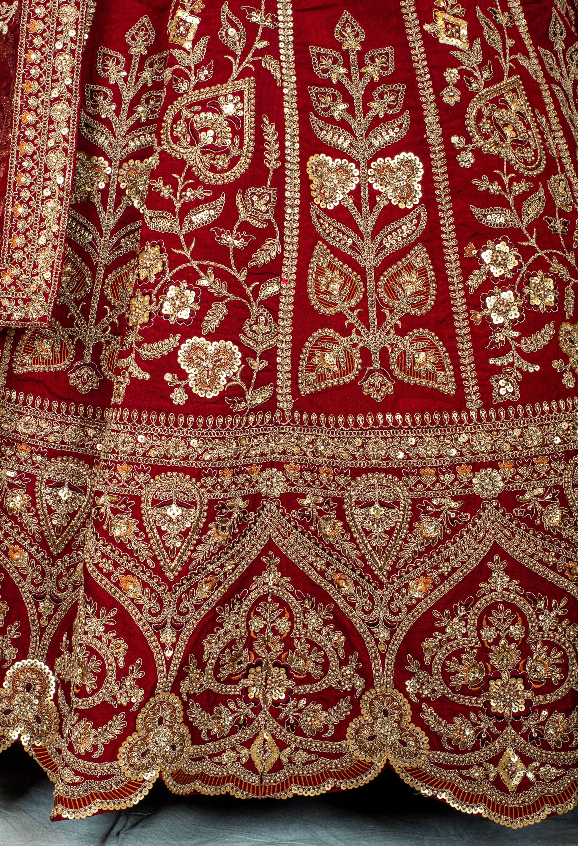 Make a grand statement on your wedding day with this traditional red bridal lehenga, richly adorned with intricate golden zari embroidery and delicate sequin work. The lehenga skirt features bold floral and paisley motifs, crafted to perfection for a regal bridal look.