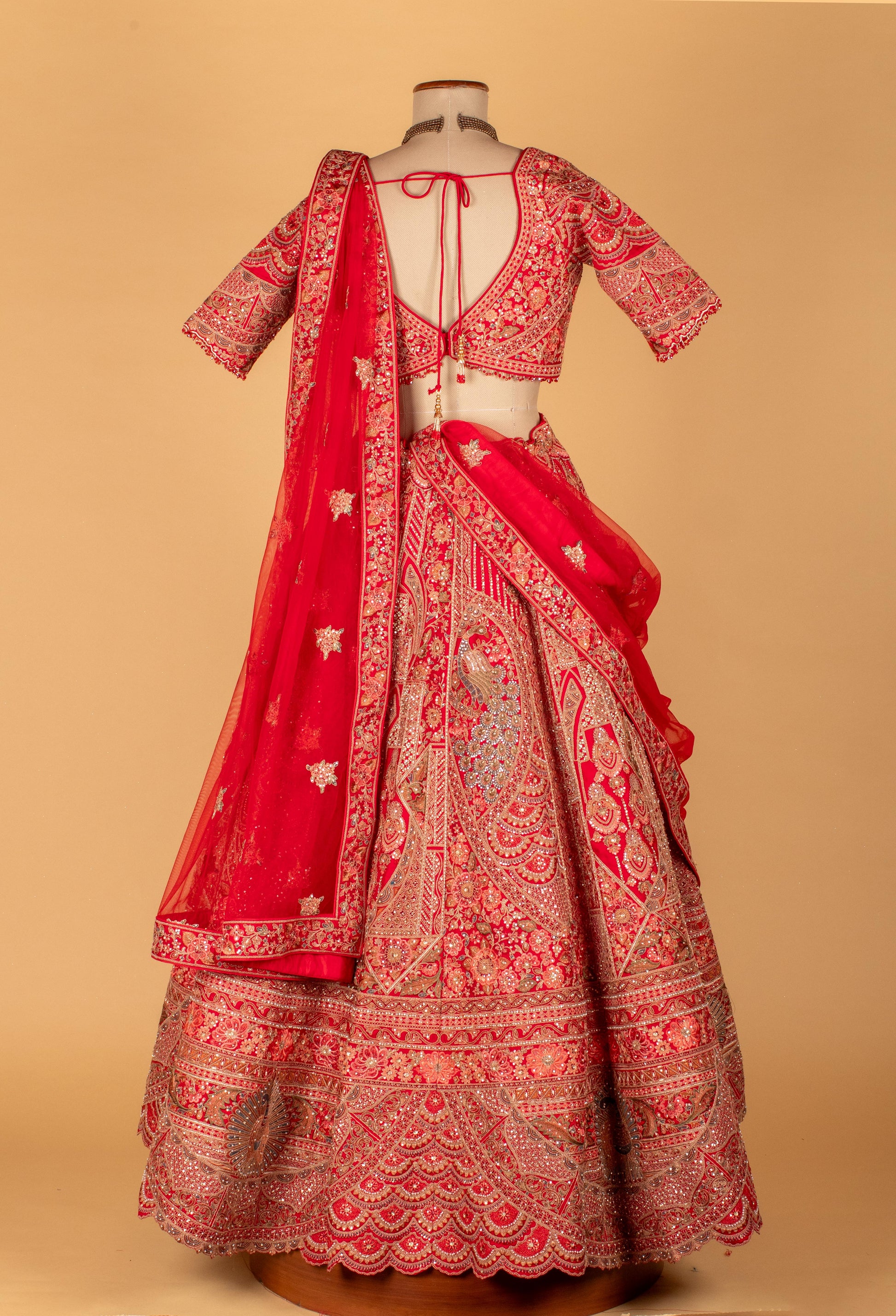 Celebrate bridal magnificence with this crimson red hand-embroidered lehenga set, crafted to exude richness and tradition in every detail. The sweetheart-neck blouse is adorned with intricate zardosi, mirrors, sequins, and stone embellishments arranged in a stunning carved pattern that adds sculpted definition to the bust.