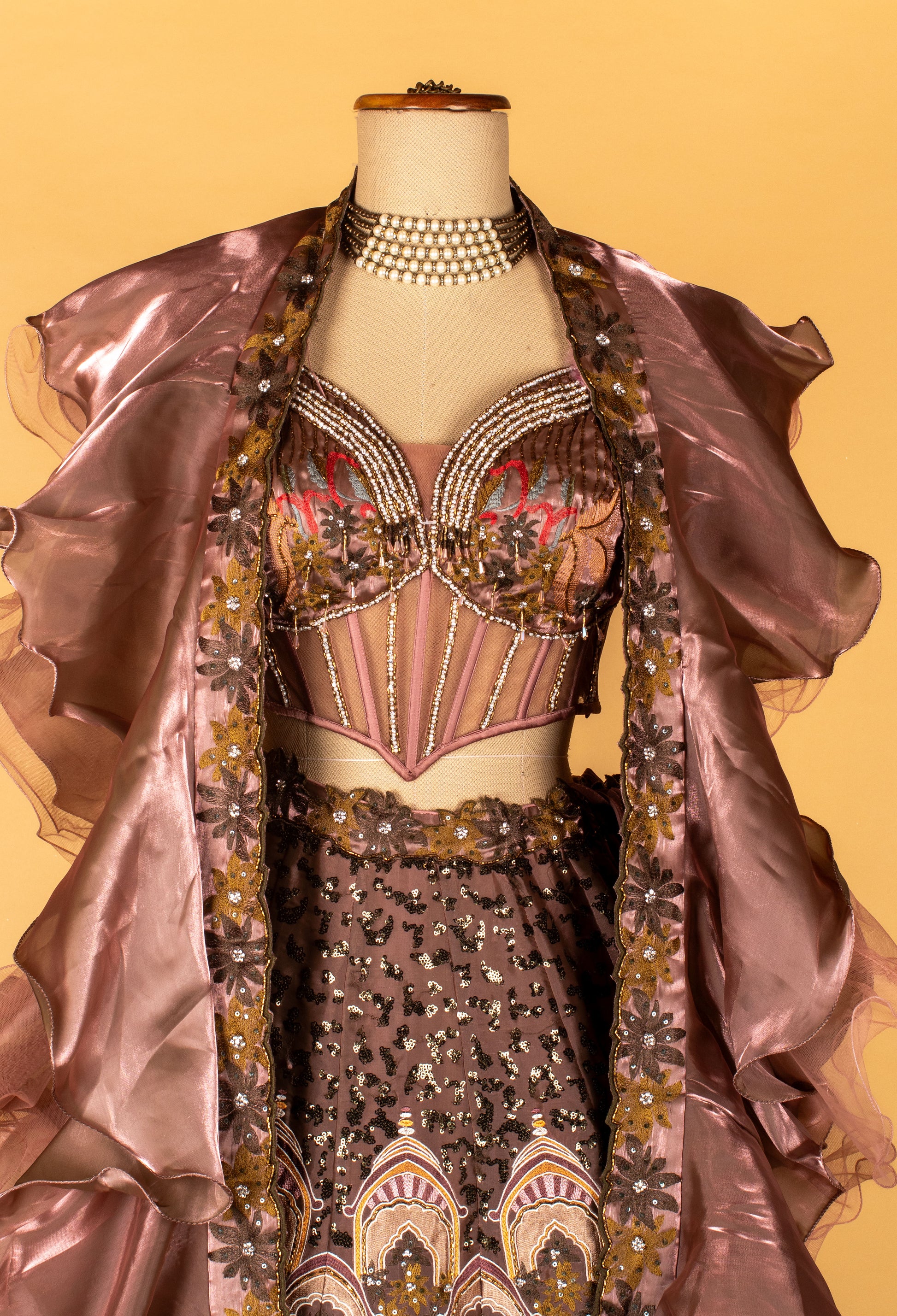 The lehenga showcases extraordinary digital print artwork inspired by architectural and nature motifs, enhanced with multi-thread embroidery, sequins, and handcrafted detailing. Accompanied by a dramatic organza ruffle cape jacket, this ensemble offers effortless movement and a high-fashion, contemporary silhouette.