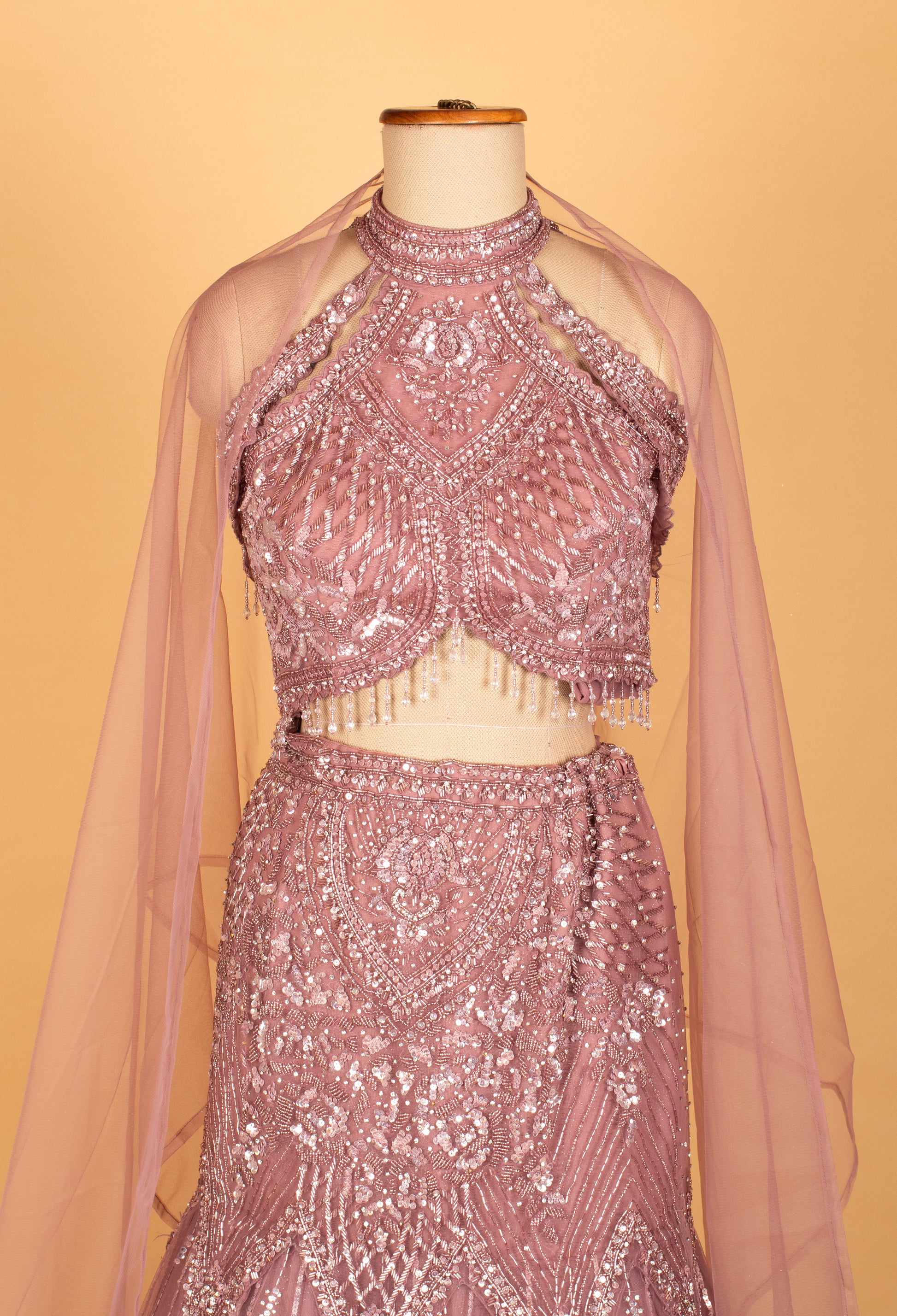 Make a glamorous entrance with this Dusty Rose Halter-Neck Croptop Lehenga Set, crafted for modern brides and festive occasions. The halter-style croptop features exquisite hand-embroidered sequin detailing, bead hangings, and a structured design that beautifully enhances the neckline and shoulders.