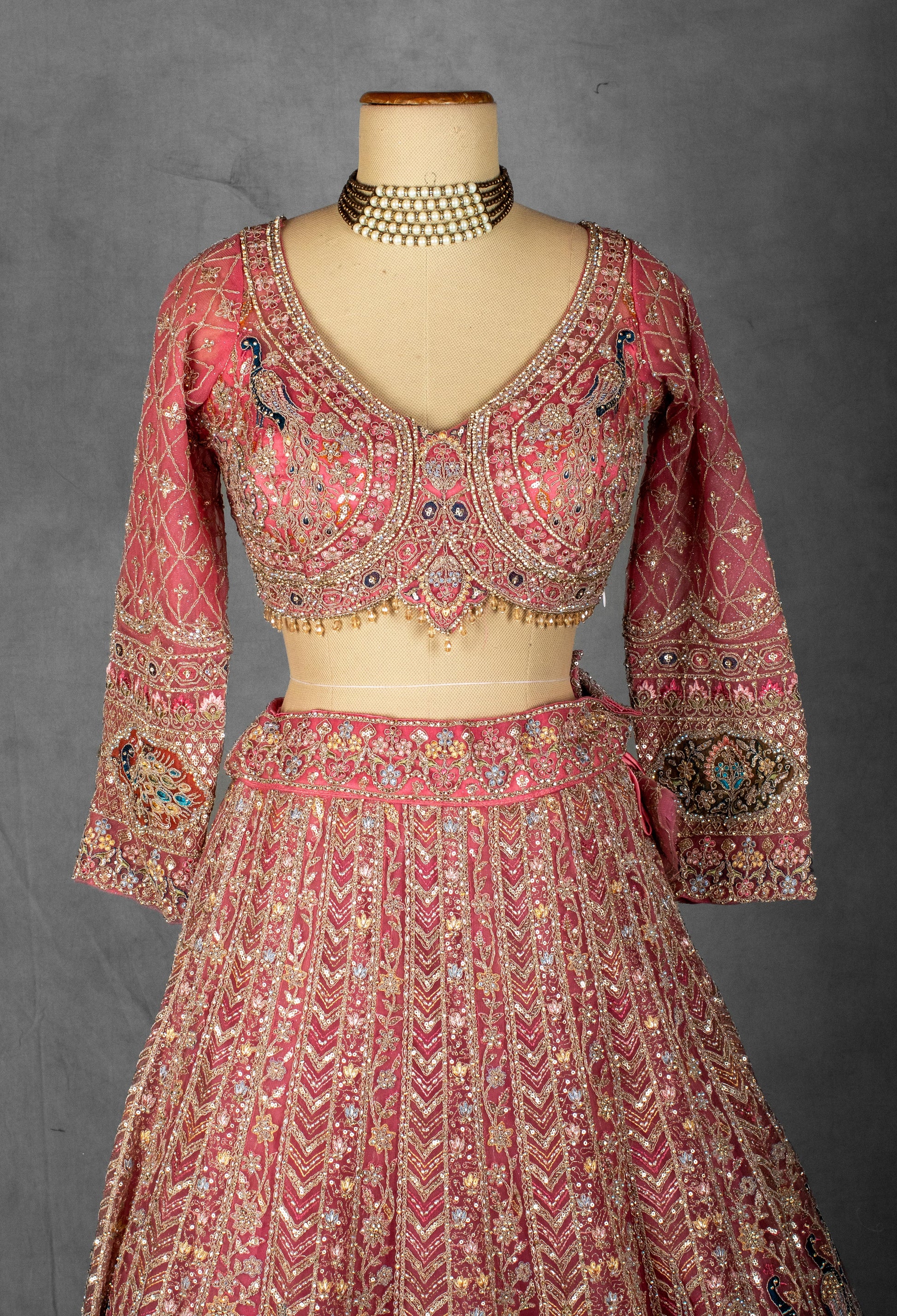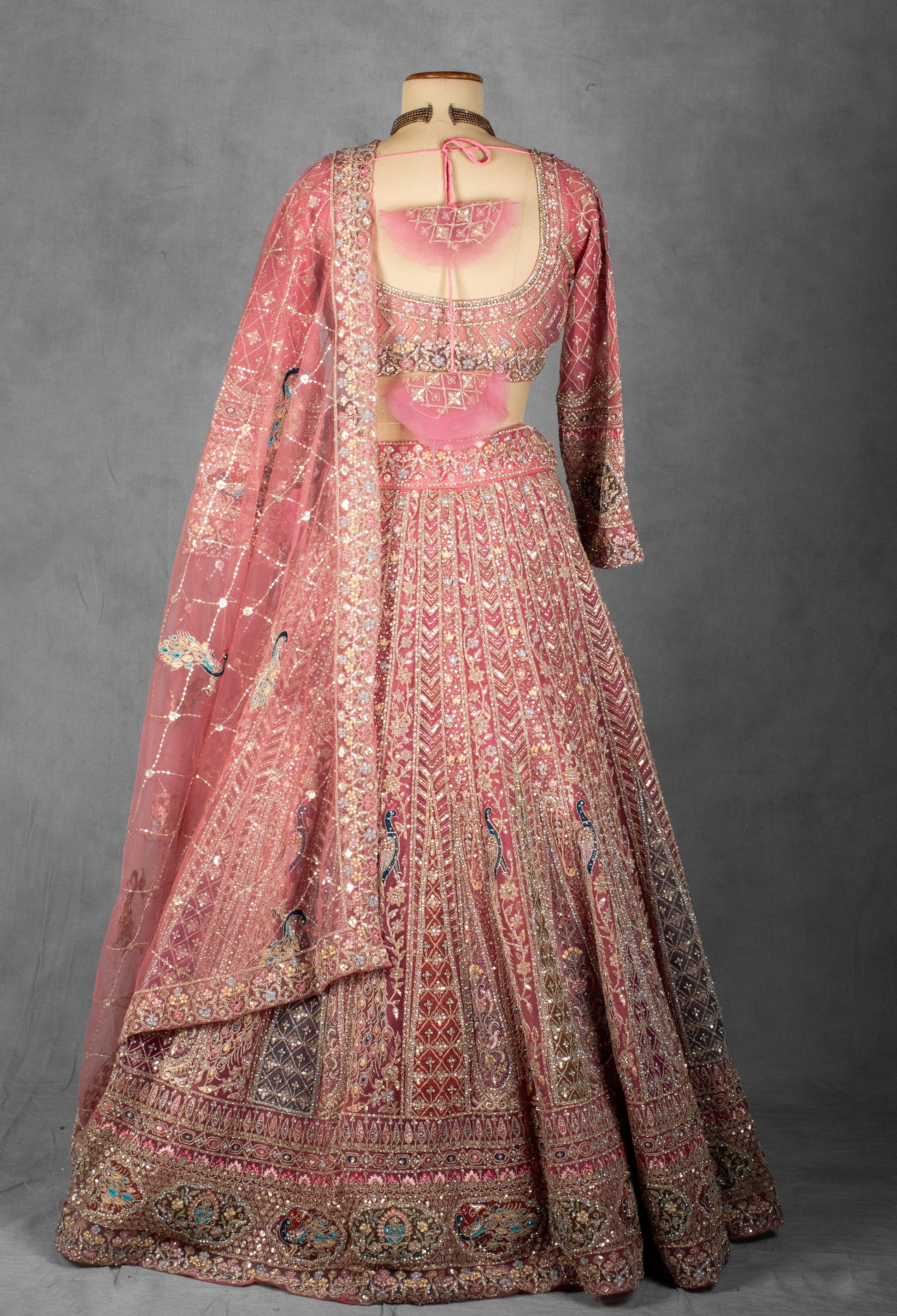 Meticulously crafted from luxurious net and silk fabric, the lehenga features delicate hand embroidery in zardosi, sequin, resham, and mirror work, enhanced with peacock and floral motifs that symbolize beauty, pride, and eternal love. The intricate design radiates sophistication, while the dusty rose hue adds a soft, modern romanticism.