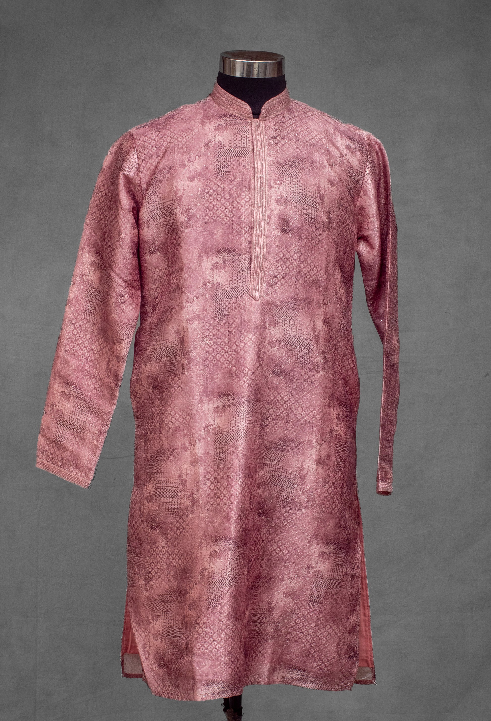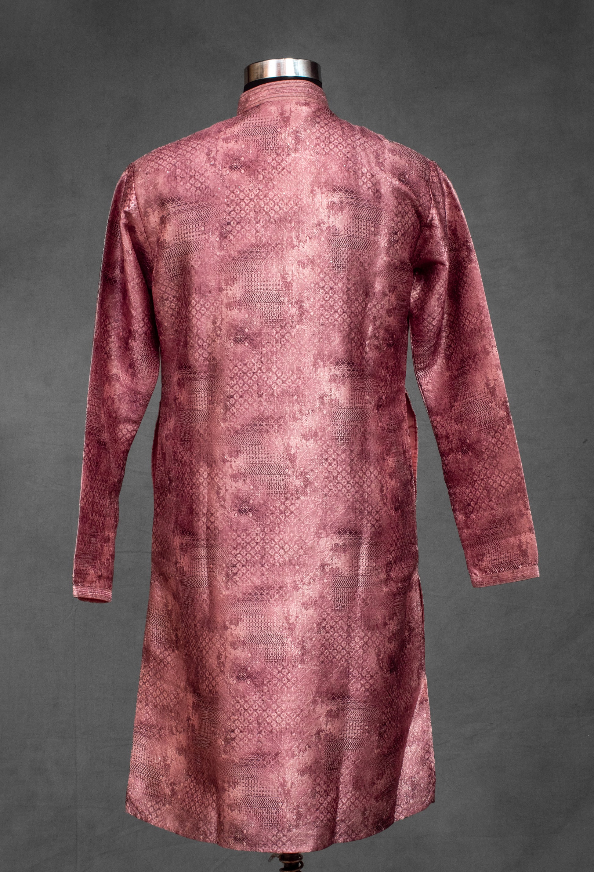 Elevate your ethnic charm with this elegant Dusty Rose Printed Silk Kurta, a perfect blend of sophistication and subtle glamour. Crafted from soft silk-blend fabric, this kurta features an intricate geometric and abstract self-pattern that adds rich texture and depth to its design.