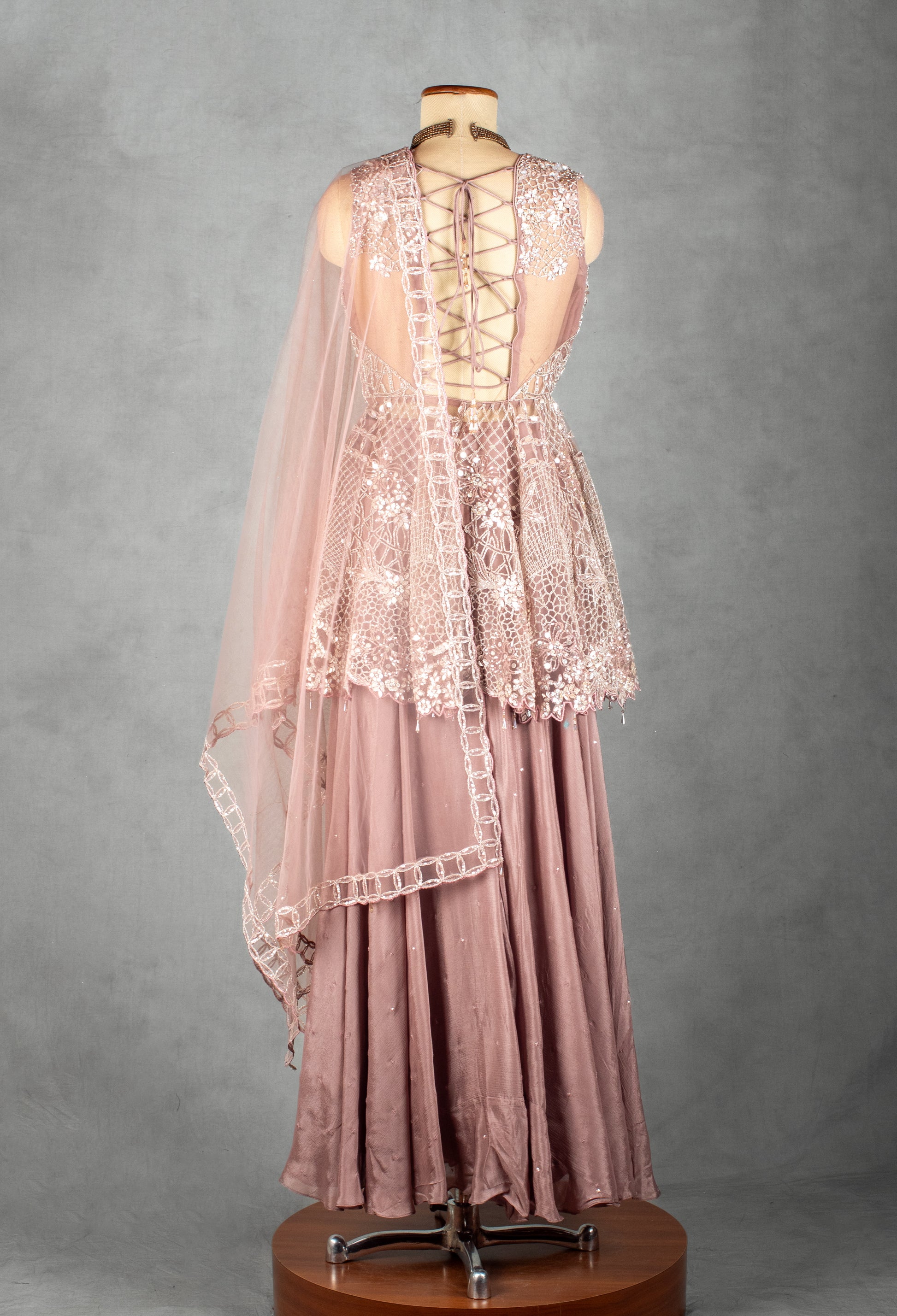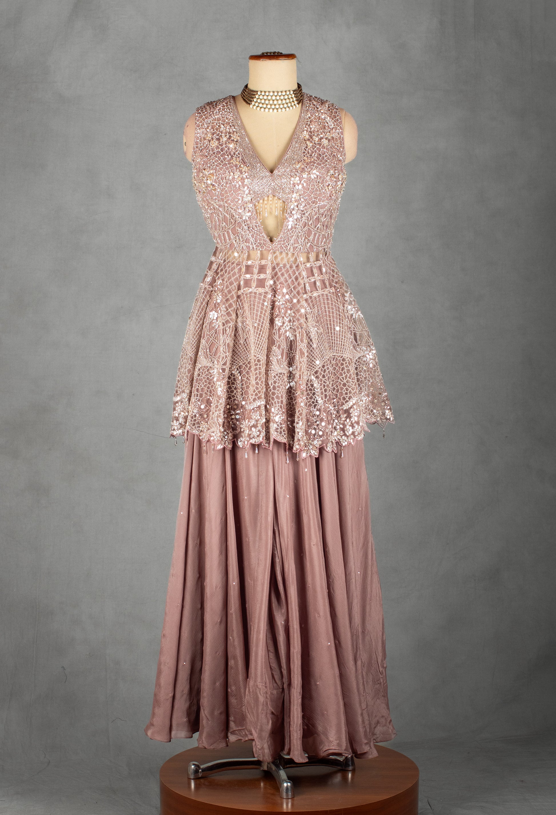 The coordinating sharara is crafted in a flowy, soft fabric that enhances movement and creates effortless charm. Paired with a matching lavender dupatta adorned with scattered embroidered buttis and a refined border, the ensemble exudes sophistication and understated glamour.