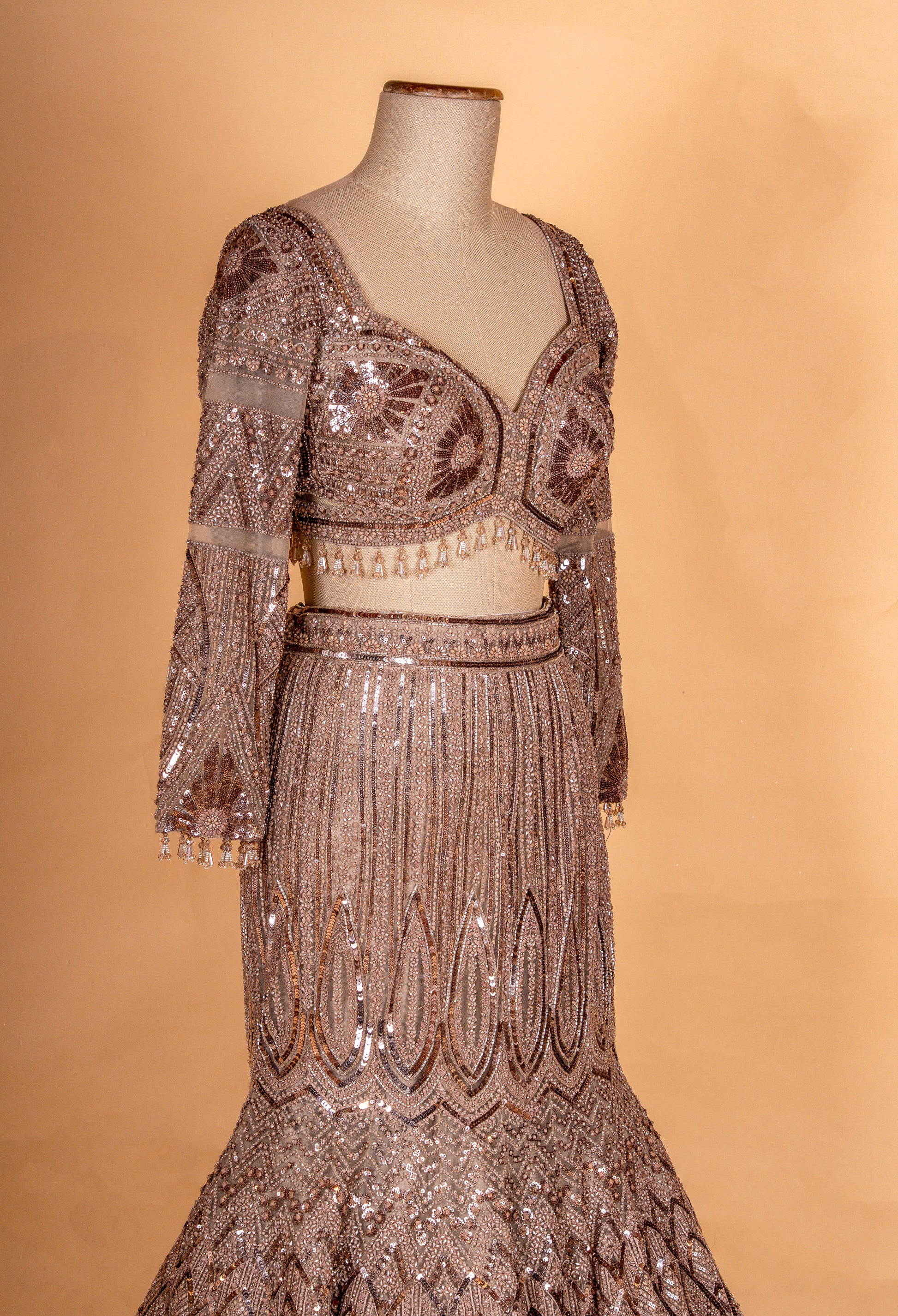 The blouse features a structured sweetheart neckline with full embellished sleeves, offering both sophistication and contemporary charm. Delicate bead tassels along the blouse hem add graceful movement and detail. The lehenga skirt showcases elaborate geometric and scalloped embroidery patterns that flow beautifully into a voluminous flare, creating a flattering and regal silhouette.
