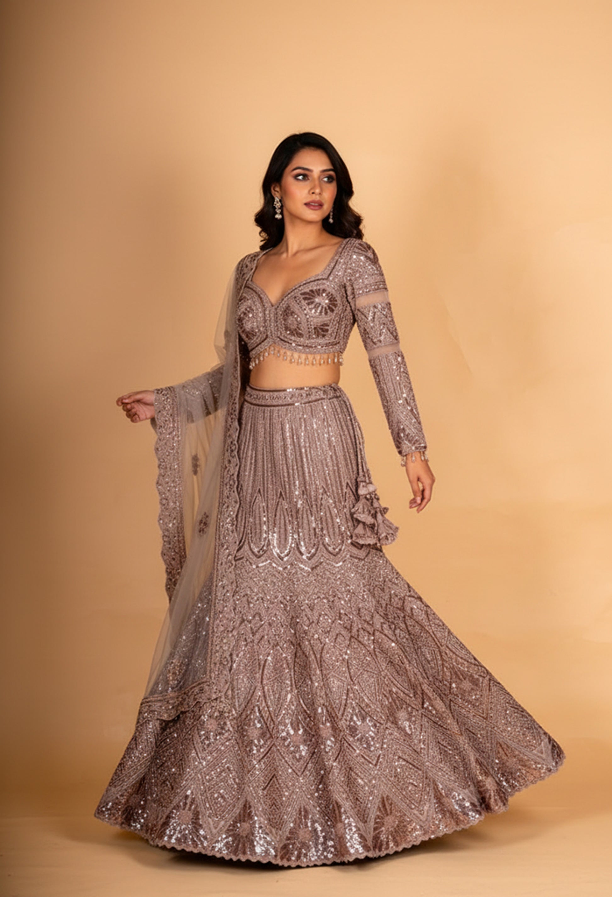 Radiate modern elegance in this stunning dusty rose sequin embroidered lehenga set, crafted for glamorous wedding celebrations and evening occasions. The soft muted rose tone paired with intricate all-over sequin and thread embroidery creates a refined yet eye-catching look.