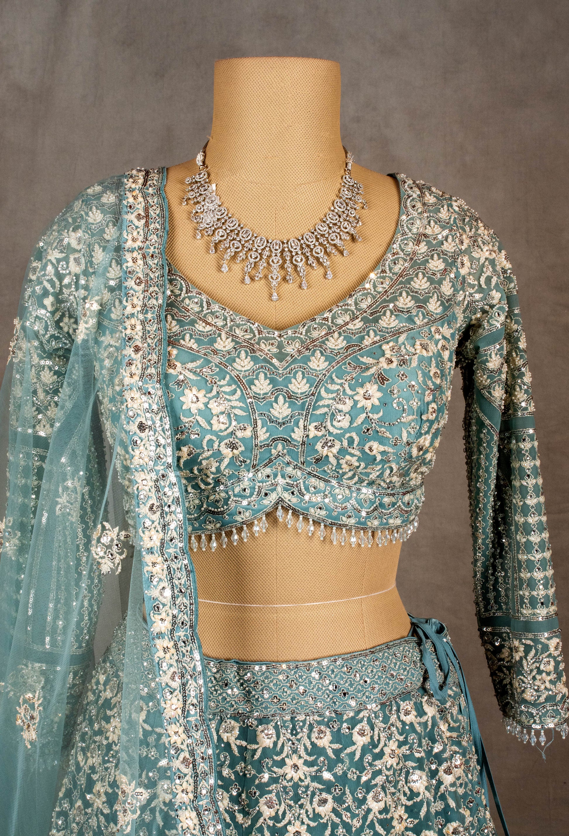 Step into tradition with a modern touch with this exquisite blue embroidered bridal lehenga choli. Crafted with intricate silver floral embroidery and delicate beadwork, this ensemble showcases the perfect blend of elegance and craftsmanship. The full-sleeve blouse features a flattering sweetheart neckline adorned with sparkling embellishments, complementing the voluminous, heavily embroidered lehenga skirt that flows gracefully. The sheer dupatta, embellished with matching embroidery and border detailing, completes this stunning ethnic outfit. Ideal for weddings, receptions, or festive celebrations, this lehenga set promises to make you the center of attention with its regal charm and sophisticated design.