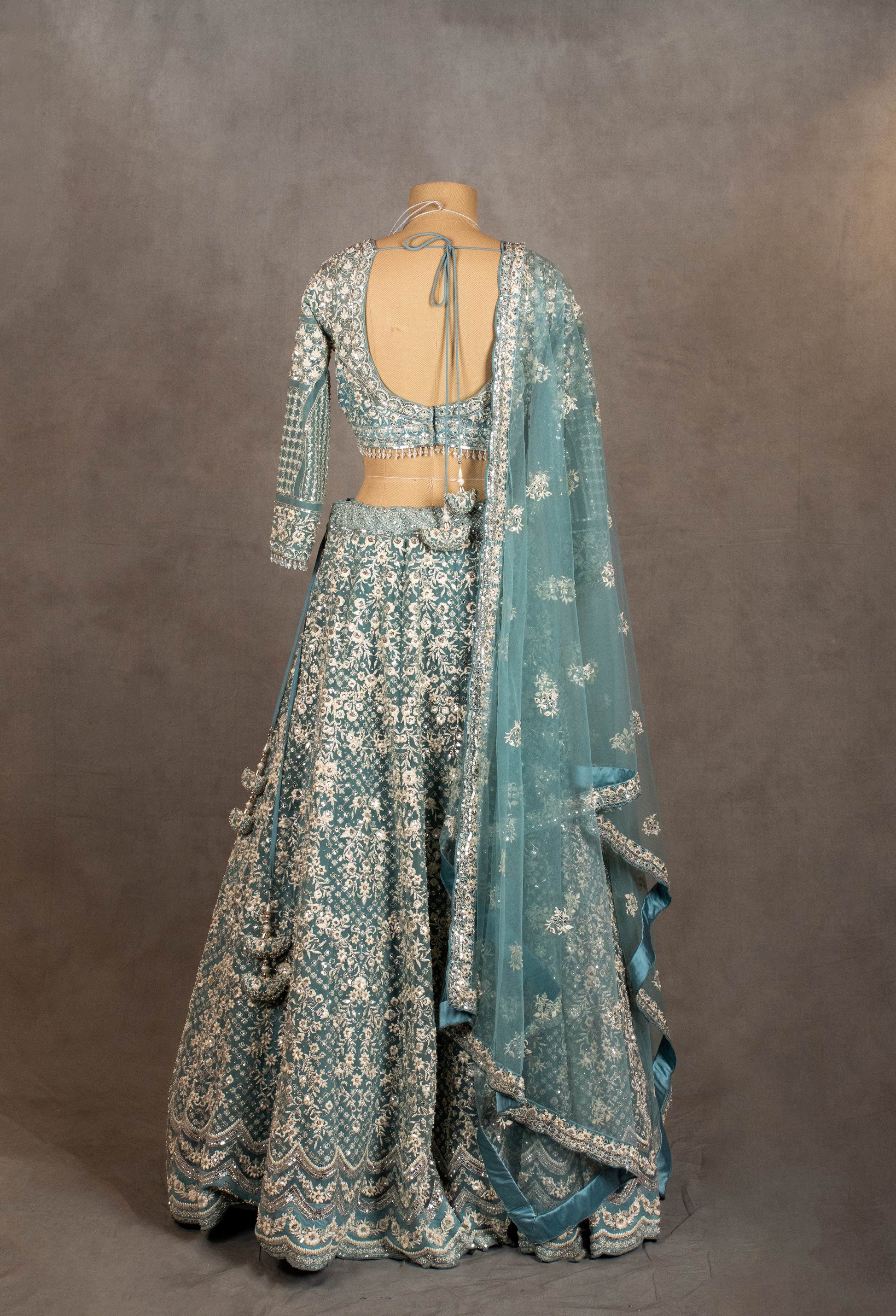 - Lehenga: Full flare skirt with heavy embroidery and scalloped hem