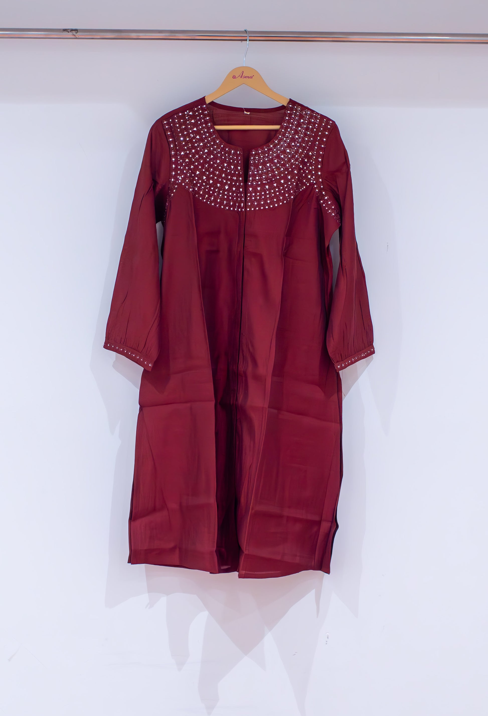 Elevate your ethnic wardrobe with this stunning maroon embellished kurta, designed to bring timeless elegance and modern charm together. The kurta features intricate mirror-style embellishment on the yoke and sleeve cuffs, creating a graceful, festive look without being overpowering.
