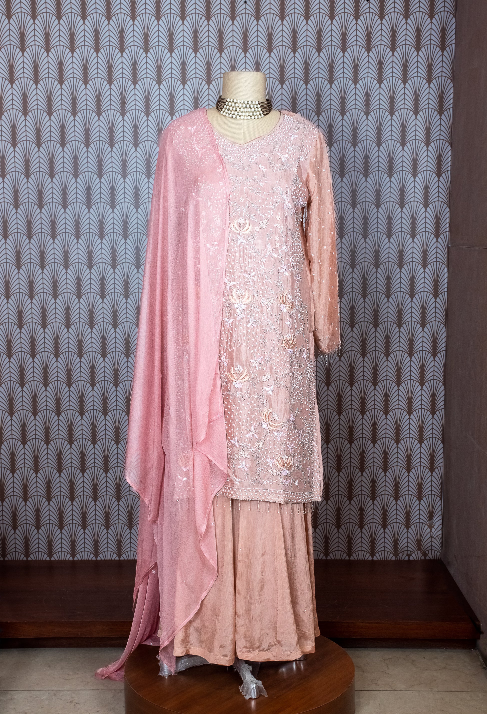Step into elegance with this stunning Peach Embroidered Kurta paired with matching Palazzo pants. Crafted from premium quality fabric, this traditional ethnic ensemble showcases intricate floral embroidery, beadwork, and delicate detailing that adds a luxurious touch to your festive and special occasion wardrobe. The kurta features a flattering V-neckline and full sleeves adorned with subtle embroidered dots, creating a perfect balance between sophistication and comfort. The flowing palazzo pants provide ease of movement while maintaining a chic silhouette. Ideal for weddings, festivals, or cultural gatherings, this outfit promises to elevate your style quotient with timeless grace.