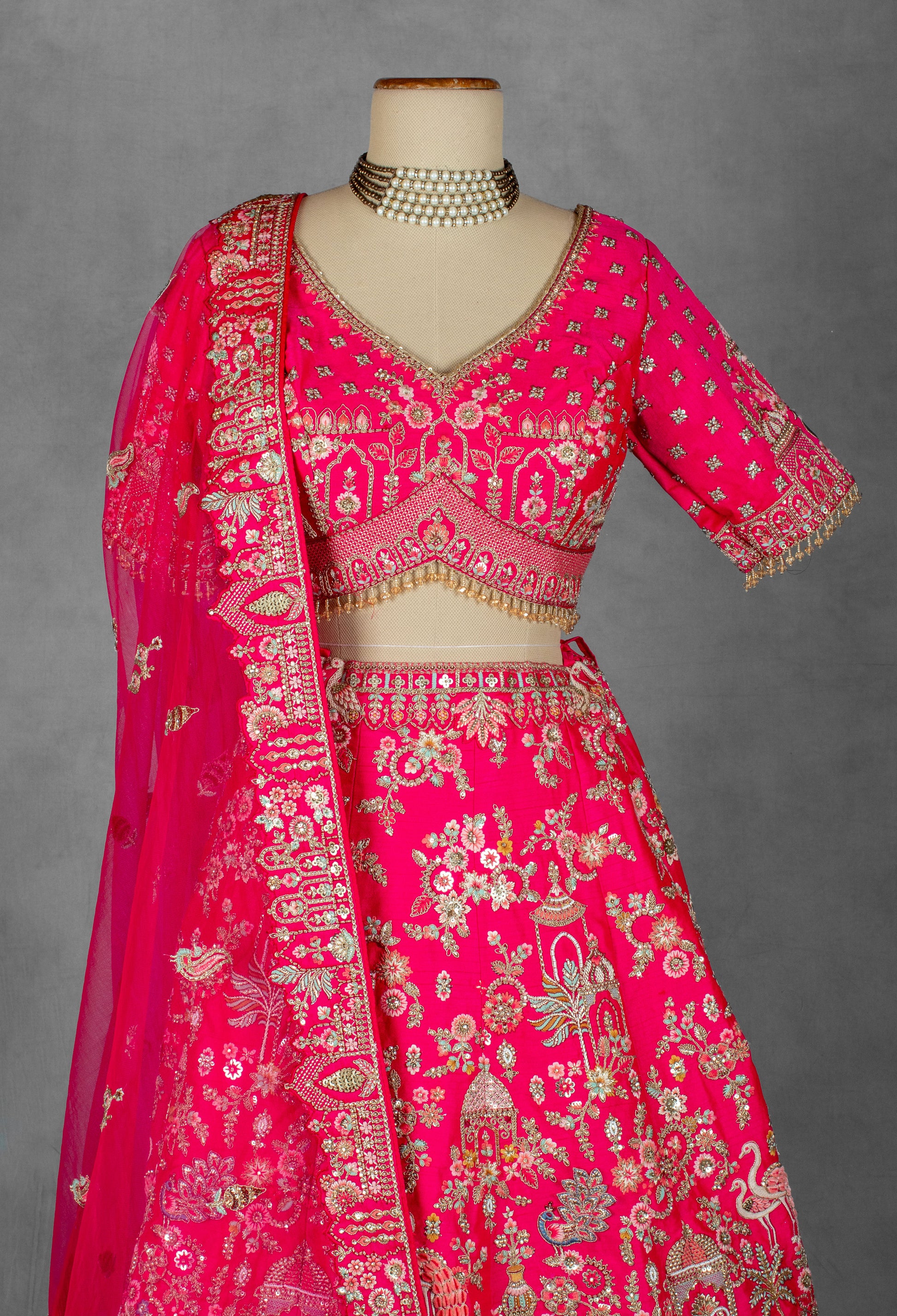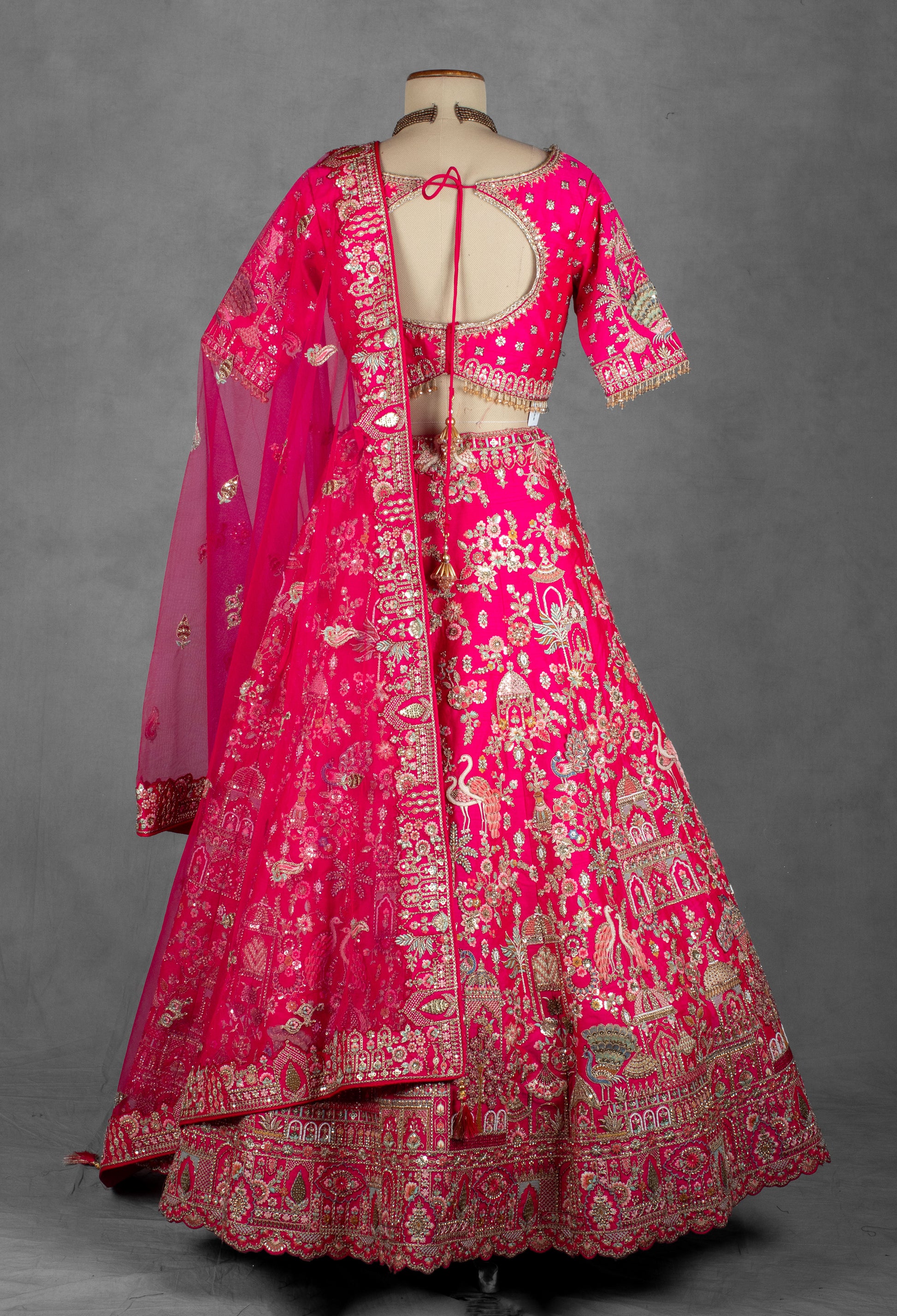 - Traditional South Asian lehenga choli set featuring a bright pink color.