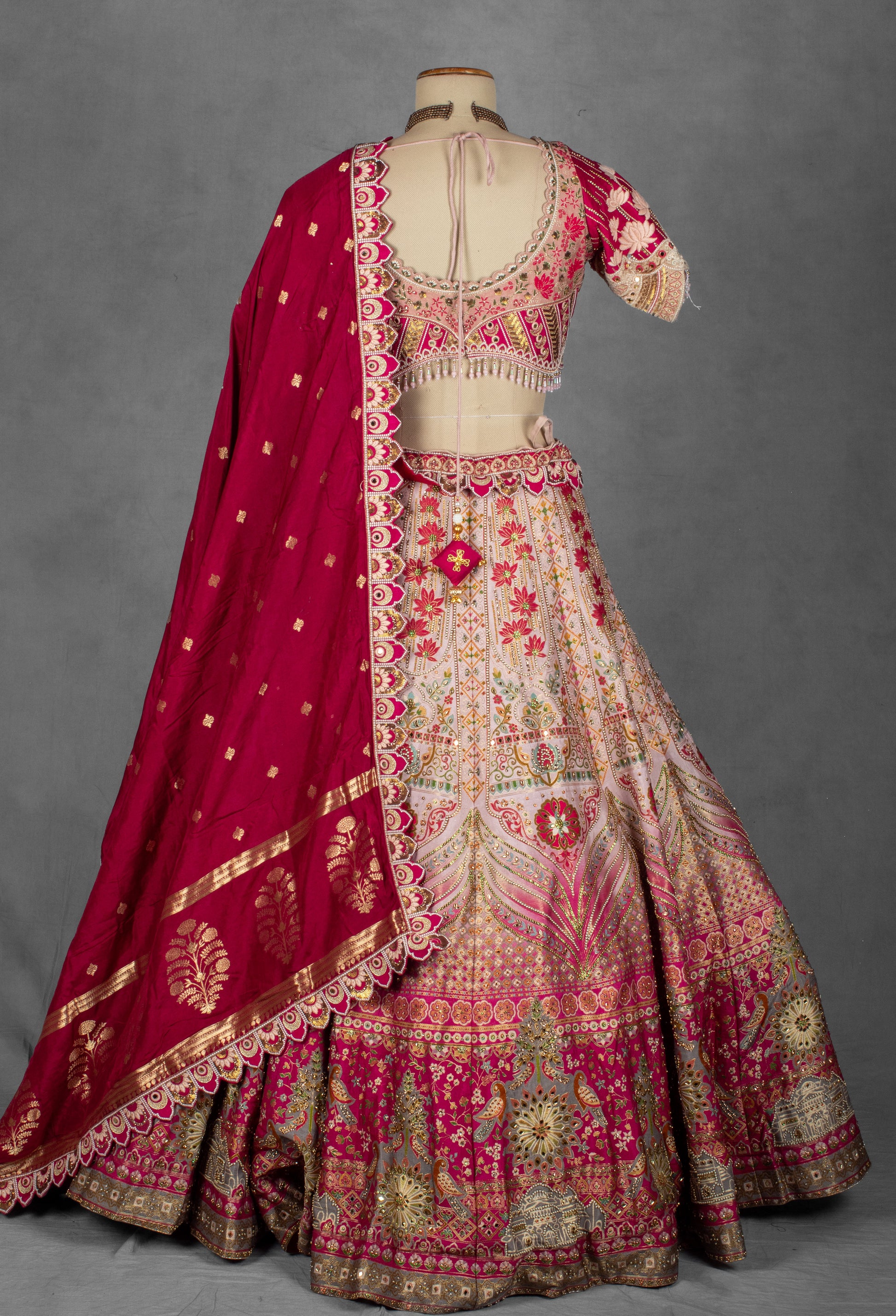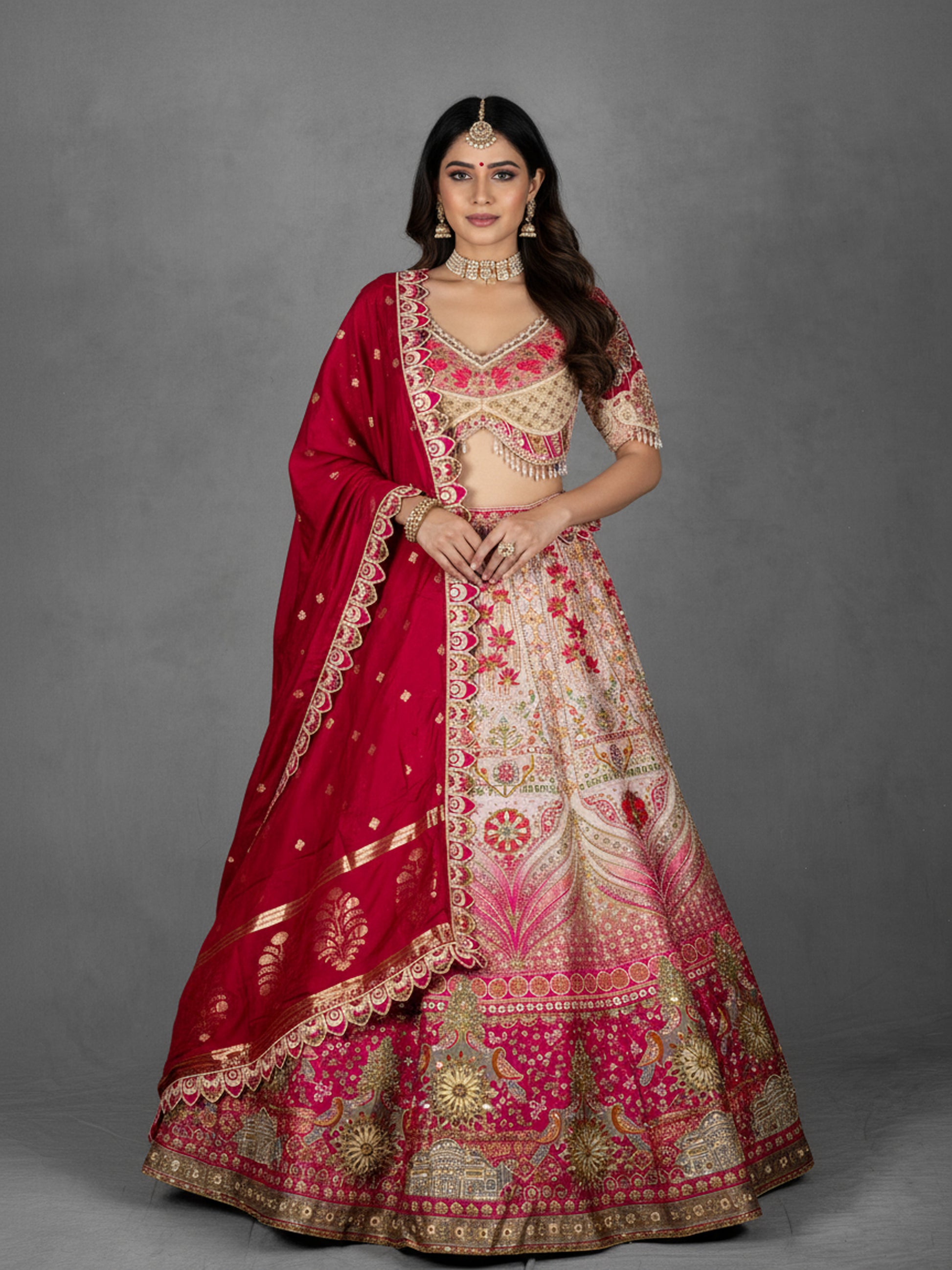 The ivory base lehenga blooms with floral, paisley, and architectural motifs — a tribute to royal Mughal aesthetics — while the rich magenta dupatta with zari and brocade border adds depth and regal charm.