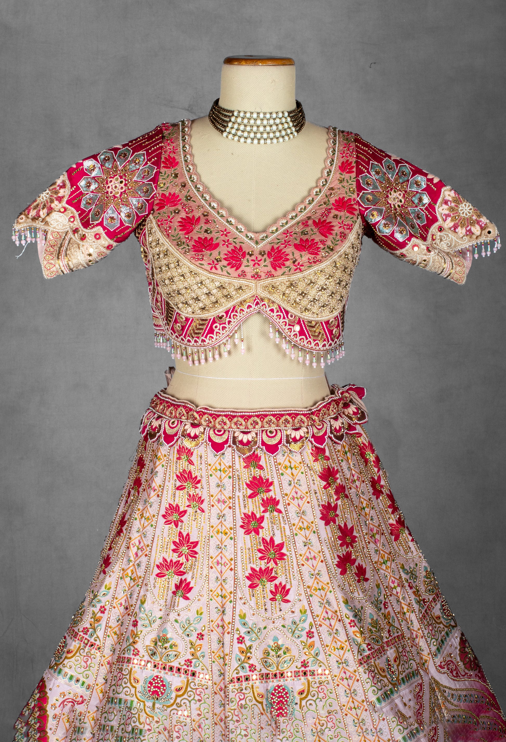 The sculpted blouse dazzles with mirror work and thread embroidery, accentuated with pearl fringes for a contemporary couture twist. Together, these elements create a look that’s both timelessly traditional and strikingly modern, making it the perfect choice for wedding day, engagement, or grand festive occasions.