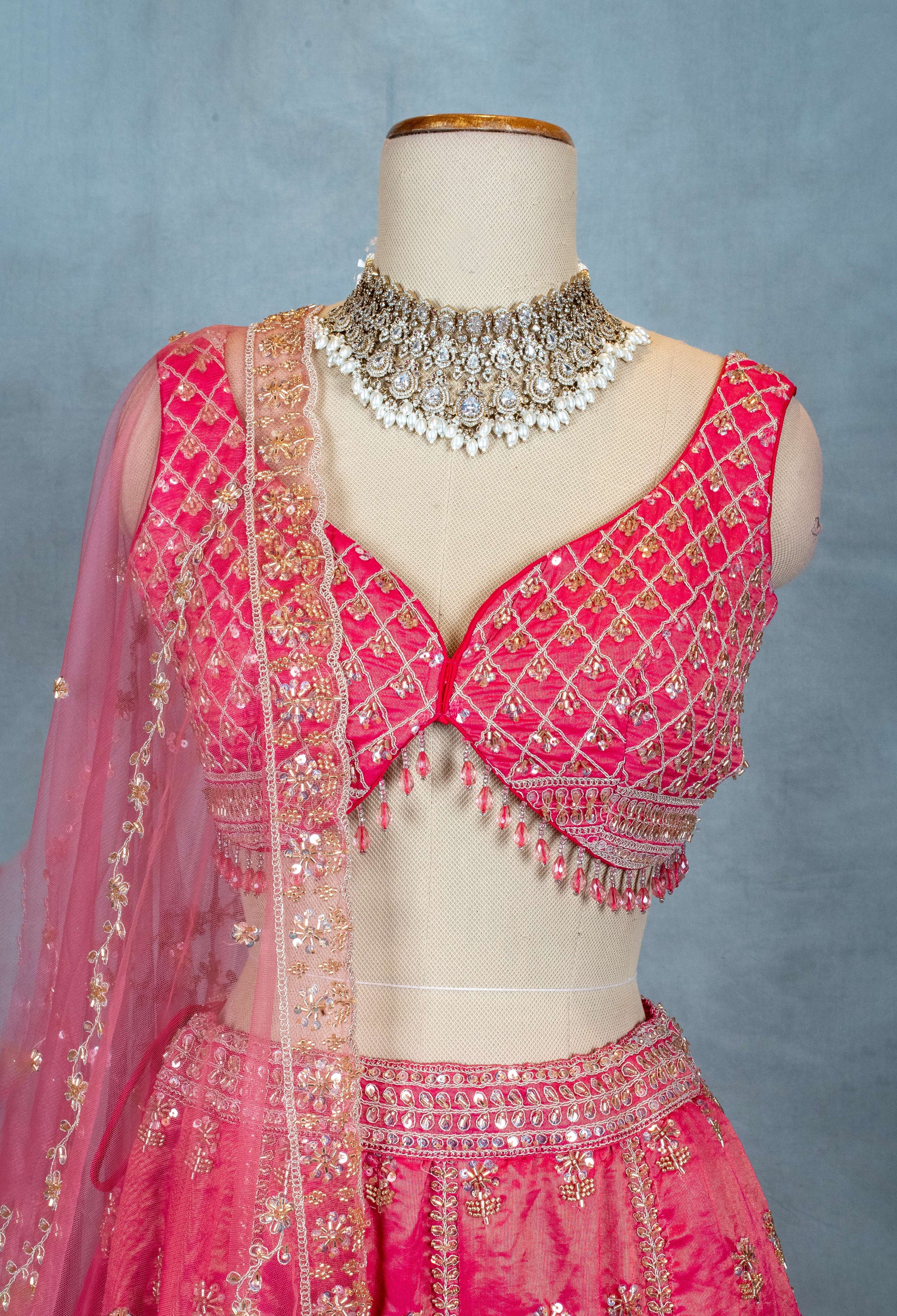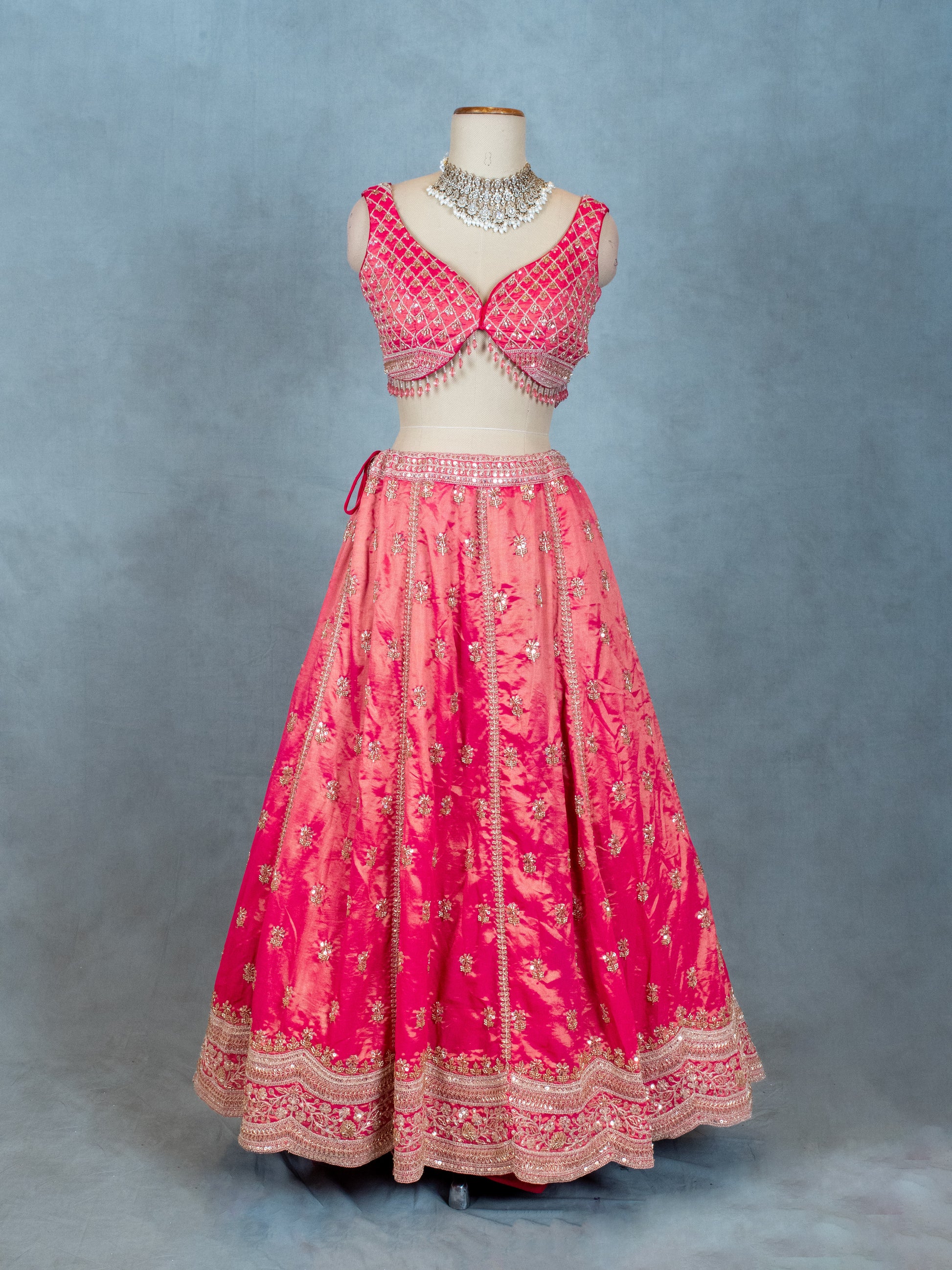 Elevate your festive and wedding wardrobe with this stunning Pink Embroidered Lehenga Choli set. Crafted with intricate golden threadwork and delicate bead embellishments, this ensemble exudes timeless elegance and grace. The rich fabric offers a subtle sheen, enhancing the overall look and making it perfect for special occasions. The lehenga features detailed embroidery along the borders and floral motifs scattered throughout, complemented beautifully by a matching net dupatta adorned with exquisite embroidery and beadwork. The sleeveless blouse, with its intricate crisscross embroidery and fringe detailing, adds a modern touch to this traditional attire. Pair this lehenga set with statement jewelry for a captivating ethnic look.