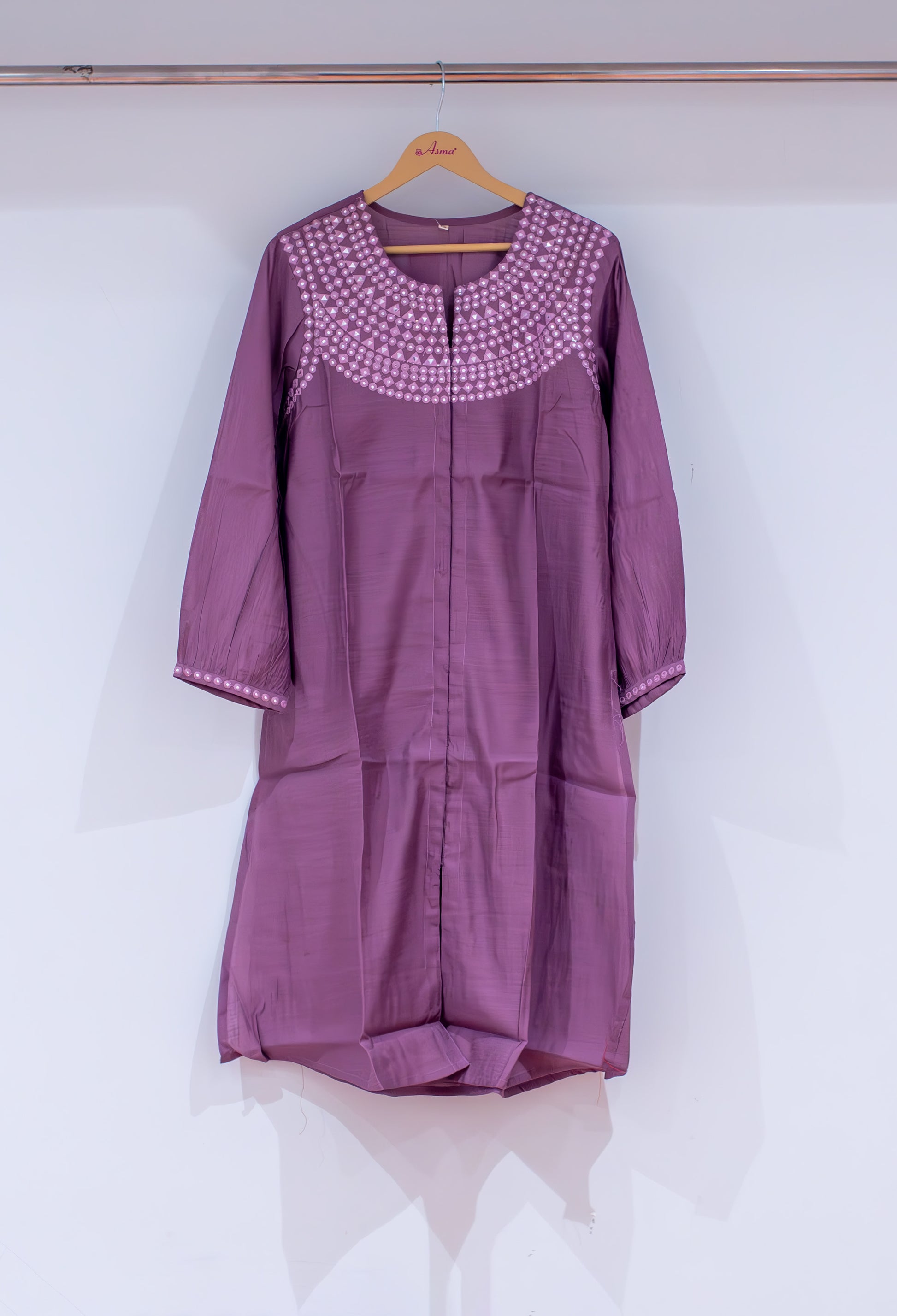 Add a touch of refined glamour to your ethnic wardrobe with this beautiful purple embellished kurta. Designed with intricate pearl-style embellishments on the yoke and sleeve cuffs, this kurta offers a perfect blend of elegance and comfort.