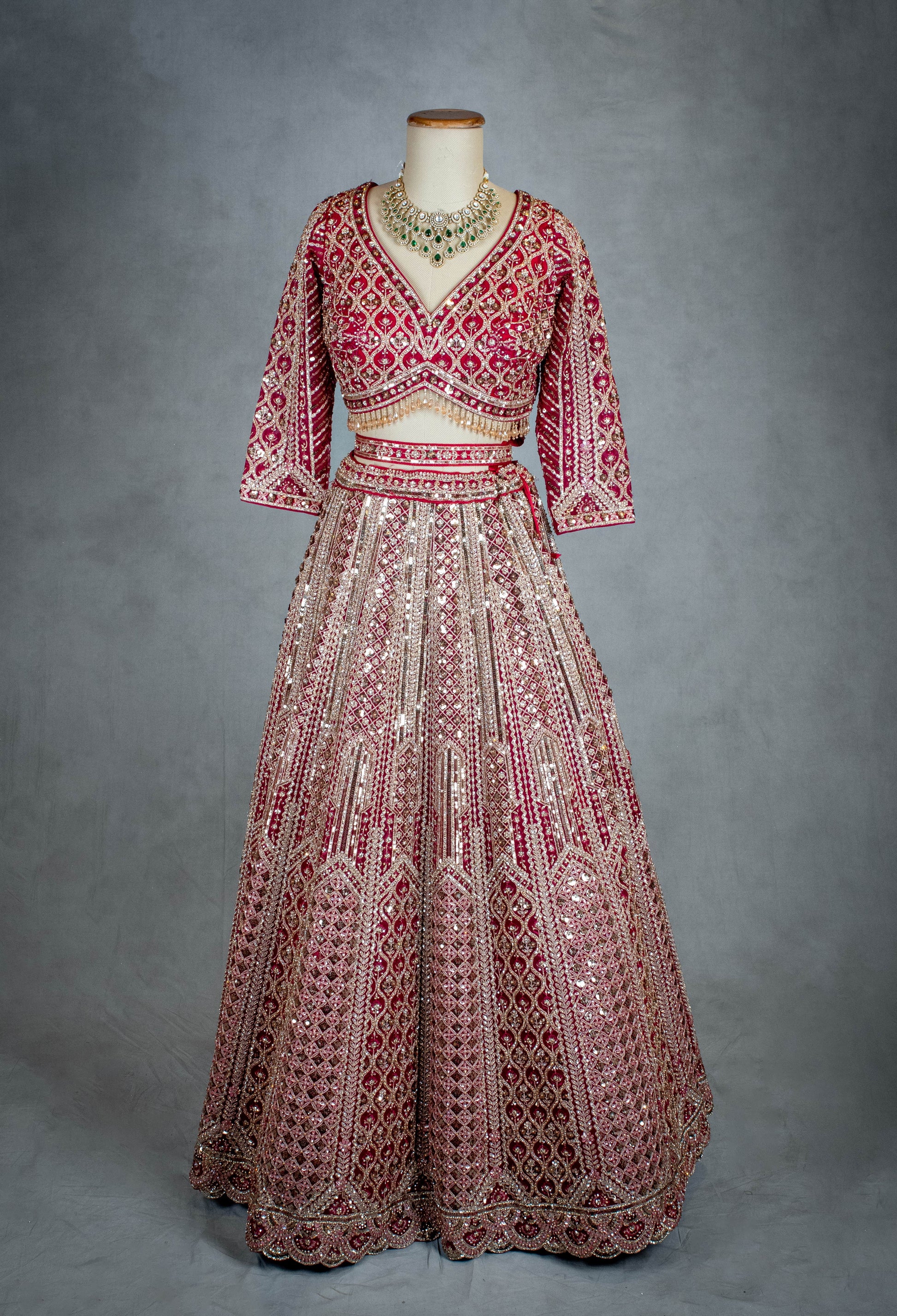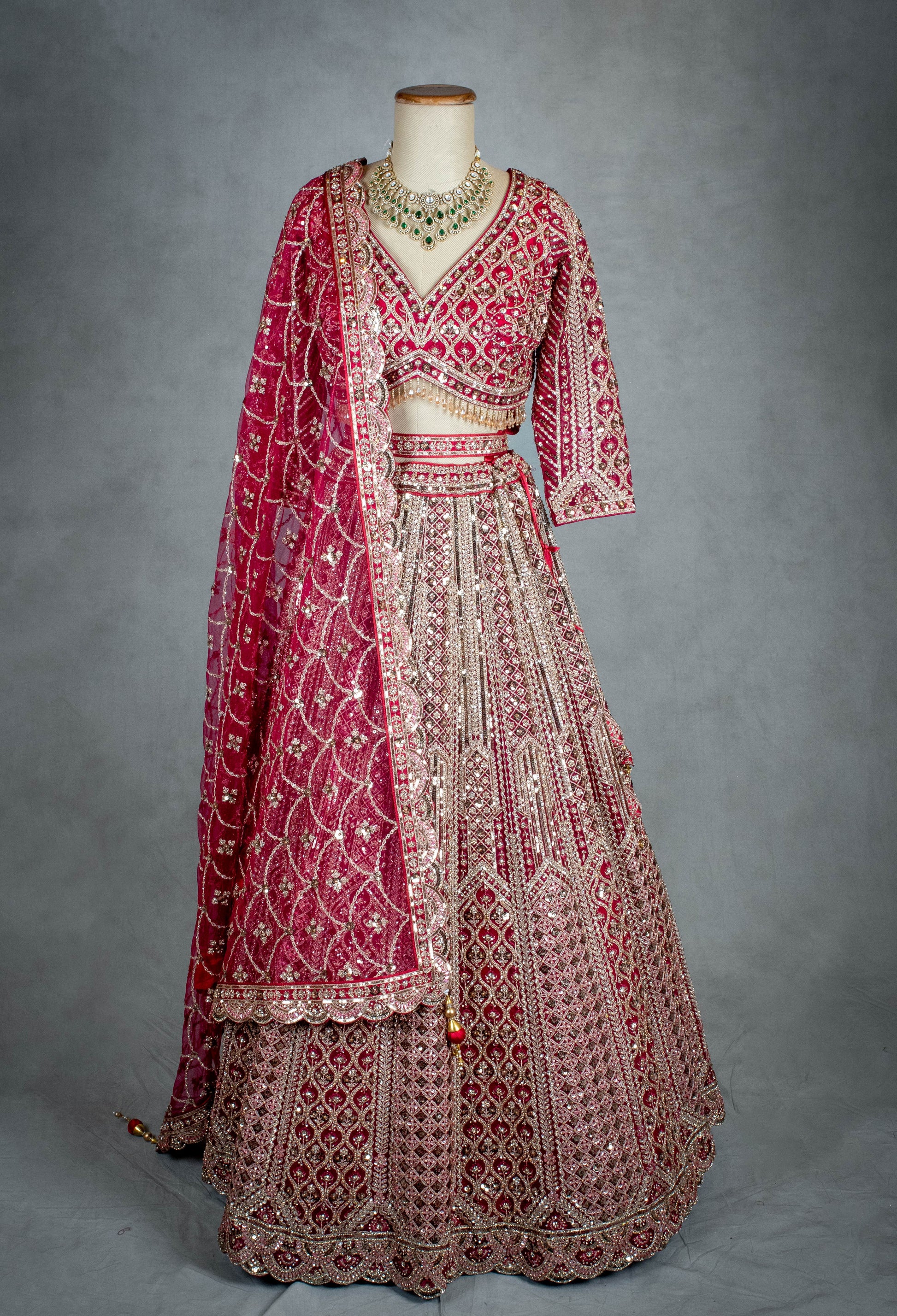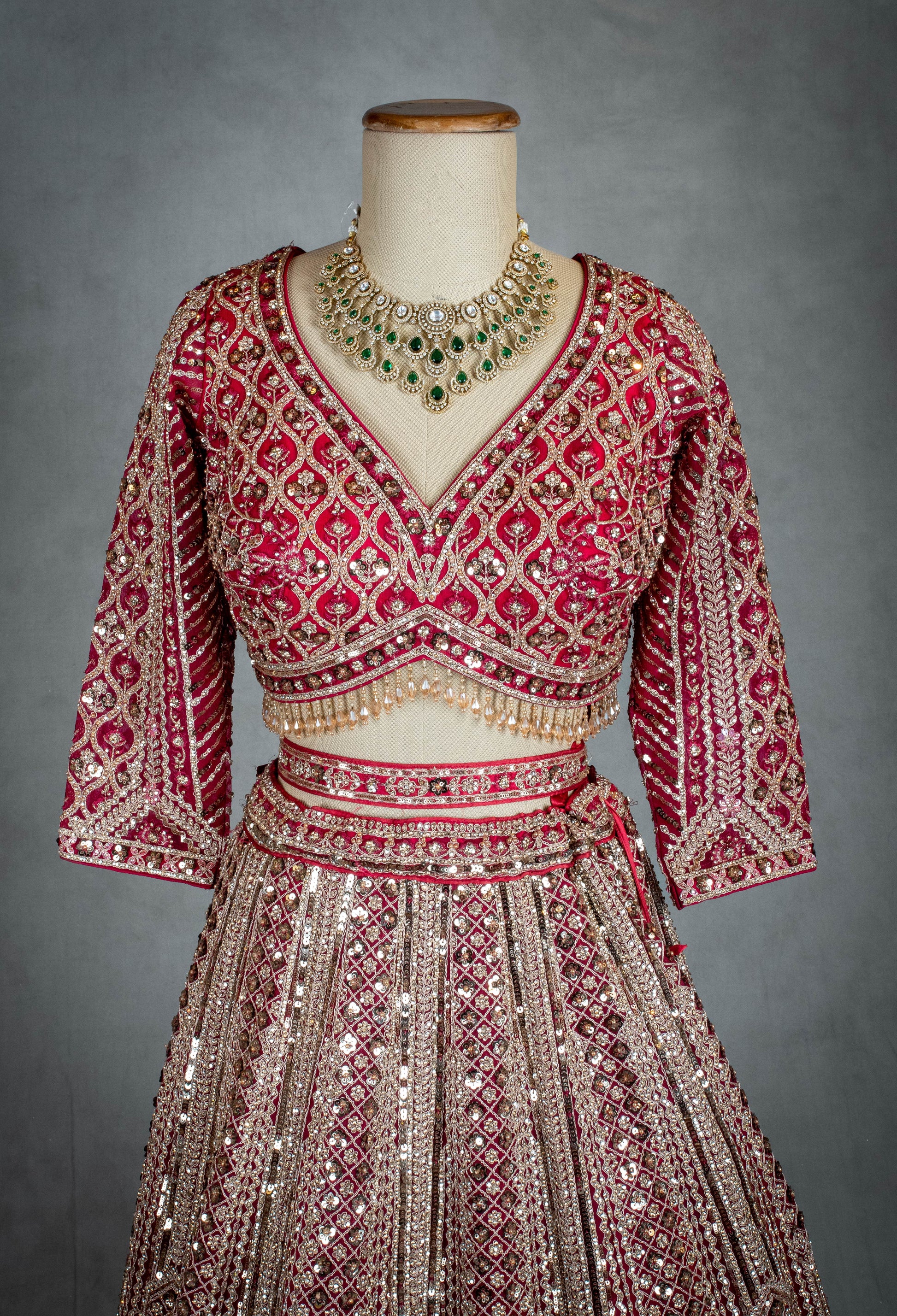 Step into elegance and tradition with this exquisite red bridal lehenga, beautifully adorned with intricate gold embroidery and shimmering embellishments. The ensemble features a richly detailed, deep V-neck blouse with three-quarter sleeves, complemented by a full, flared skirt showcasing elaborate patterns in gold threadwork. The sheer dupatta adds a delicate touch with matching embroidery and scalloped borders, completing the look with grace and sophistication. Perfect for weddings, festive occasions, and cultural celebrations, this lehenga promises to make you the center of attention with its luxurious craftsmanship and timeless appeal.