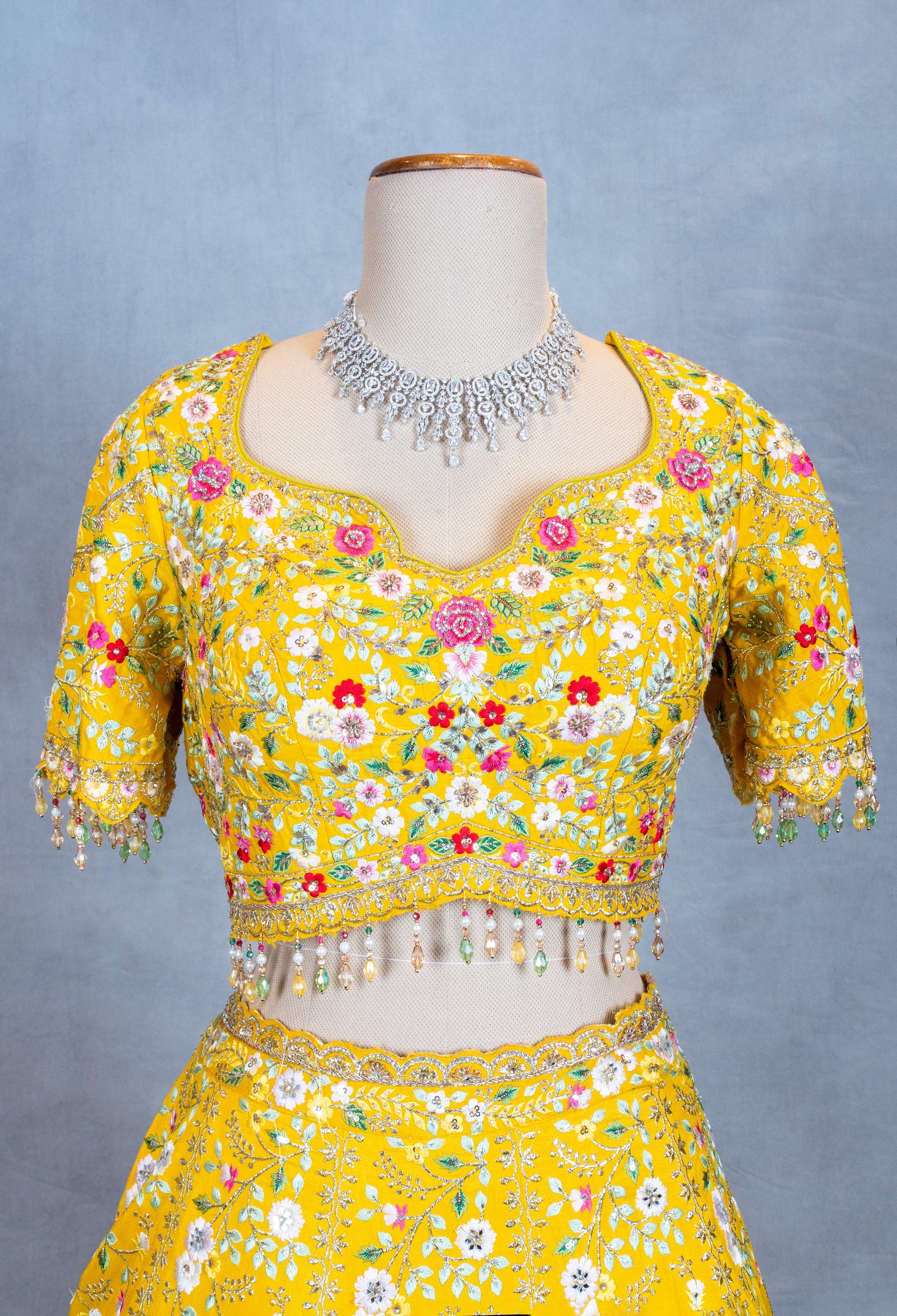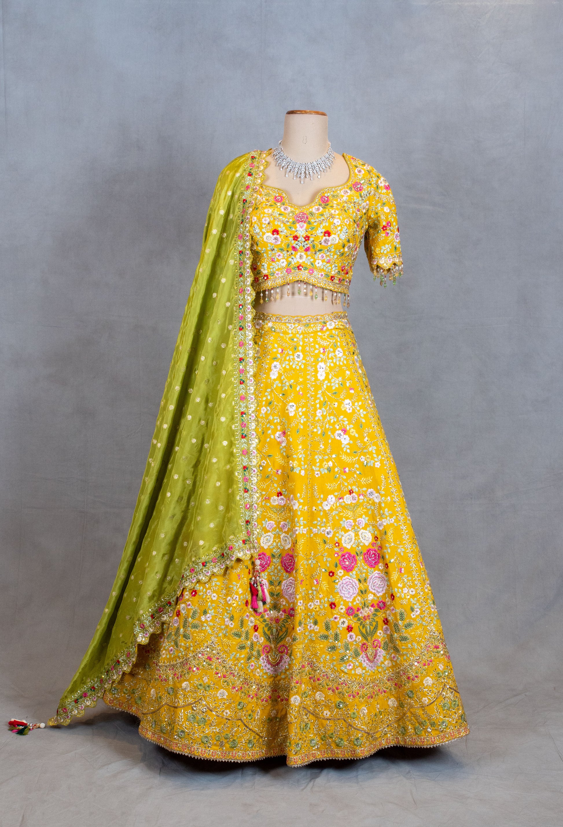 Elevate your festive and wedding wardrobe with this stunning Yellow Floral Embroidered Lehenga Choli. Featuring intricate multicolor floral embroidery throughout the vibrant yellow fabric, this traditional ensemble radiates elegance and charm. The blouse is beautifully designed with detailed floral patterns and delicate beadwork along the hem, complemented by a matching flowing skirt adorned with exquisite embroidery. Paired with a contrasting green dupatta embellished with small floral motifs and an ornate border, this lehenga choli is perfect for festive occasions, weddings, and celebrations. Crafted with attention to detail and quality, this ensemble offers a blend of vibrant colors and intricate craftsmanship, making it a timeless addition to your ethnic collection.