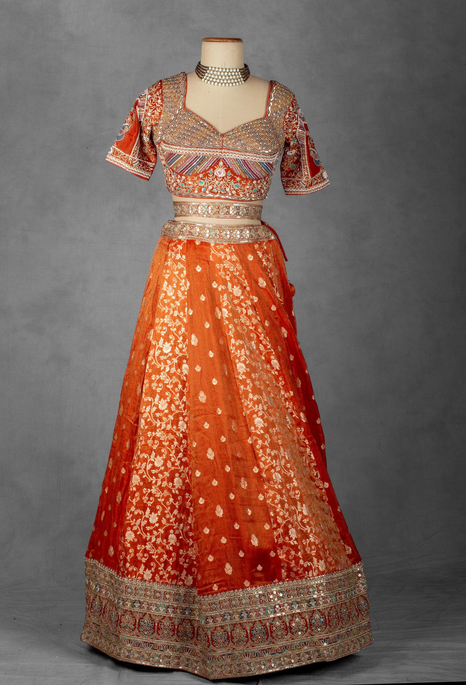 This exquisite lehenga is crafted in lustrous silk fabric, adorned with intricate mirror, zardozi, and thread embroidery that reflect royal grandeur. The vibrant orange hue symbolizes warmth, festivity, and celebration — perfect for wedding ceremonies, sangeet nights, or festive soirées.