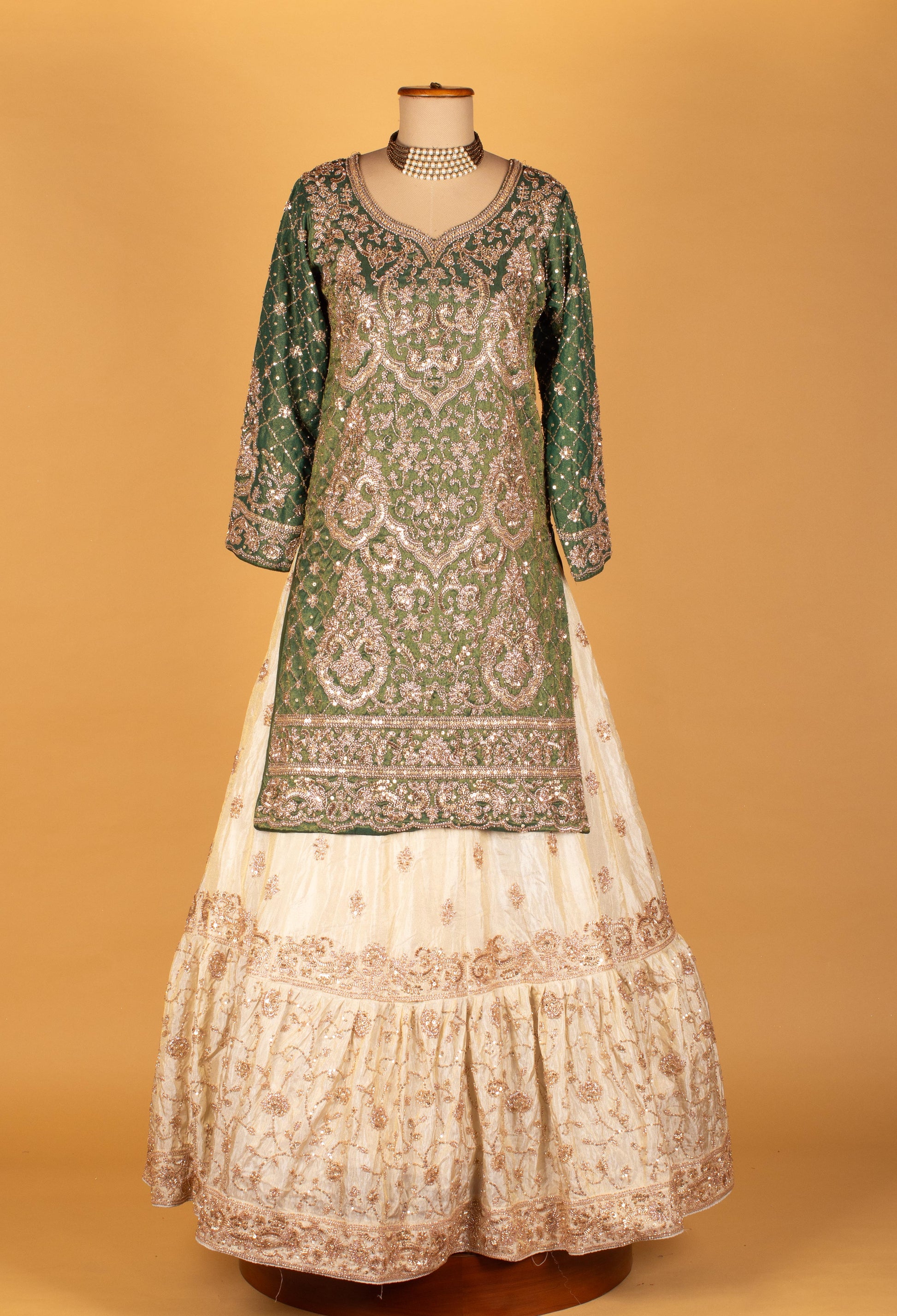 The intricately hand-embroidered green crop top features detailed zardozi and sequin craftsmanship, bringing a luxurious sparkle to every movement. It is paired with an elegant ivory flared lehenga enriched with shimmering embroidery and scalloped borders, creating a regal contrast that enhances the overall look.