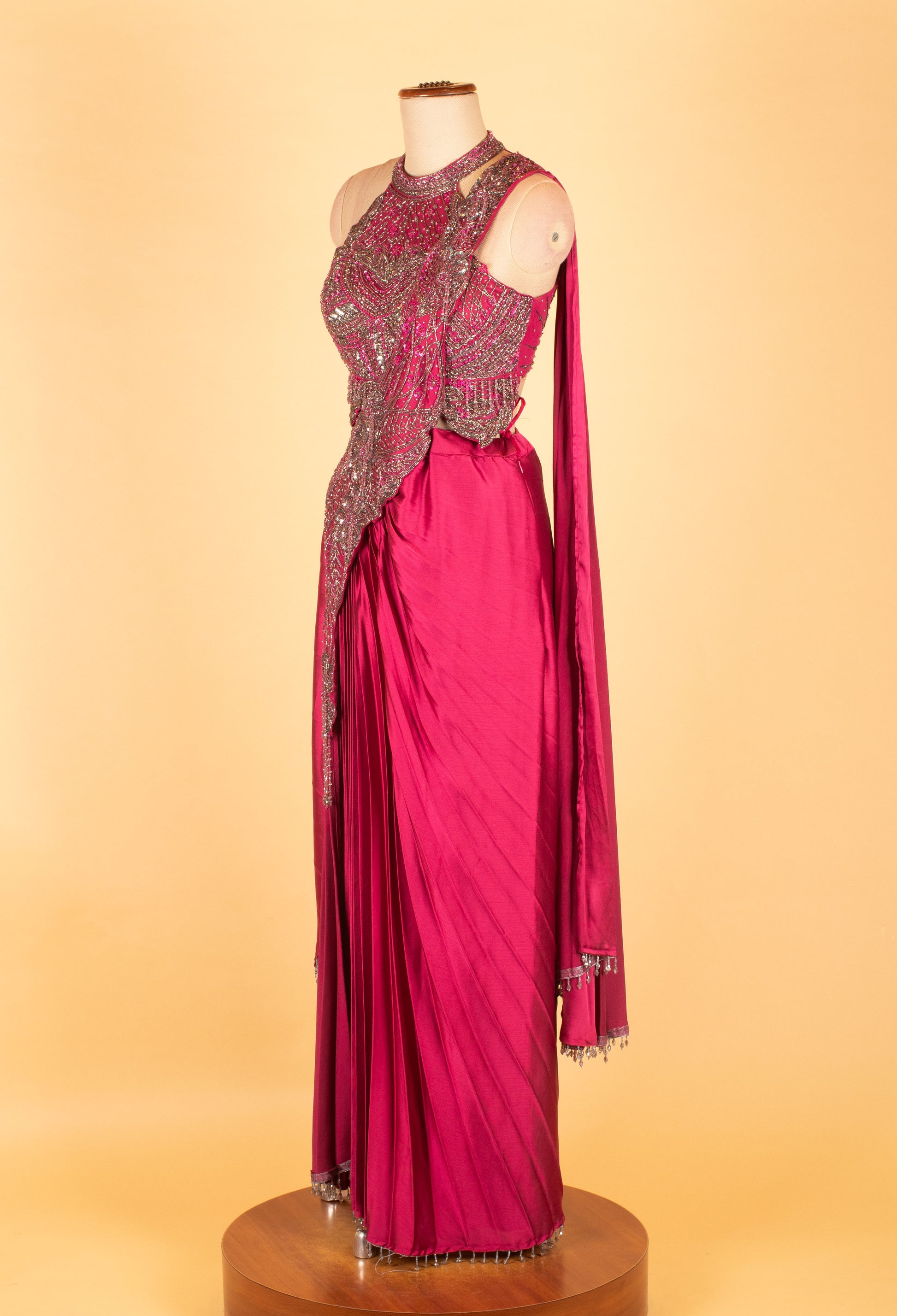 Turn heads with this sensational Fuchsia Pink Pre-Draped Saree Gown, crafted for high-end celebrations and glamorous evening events. The gown features a heavily embellished halter neck bodice, adorned with sequins, stones, and metallic threadwork for a stunning luxurious finish.