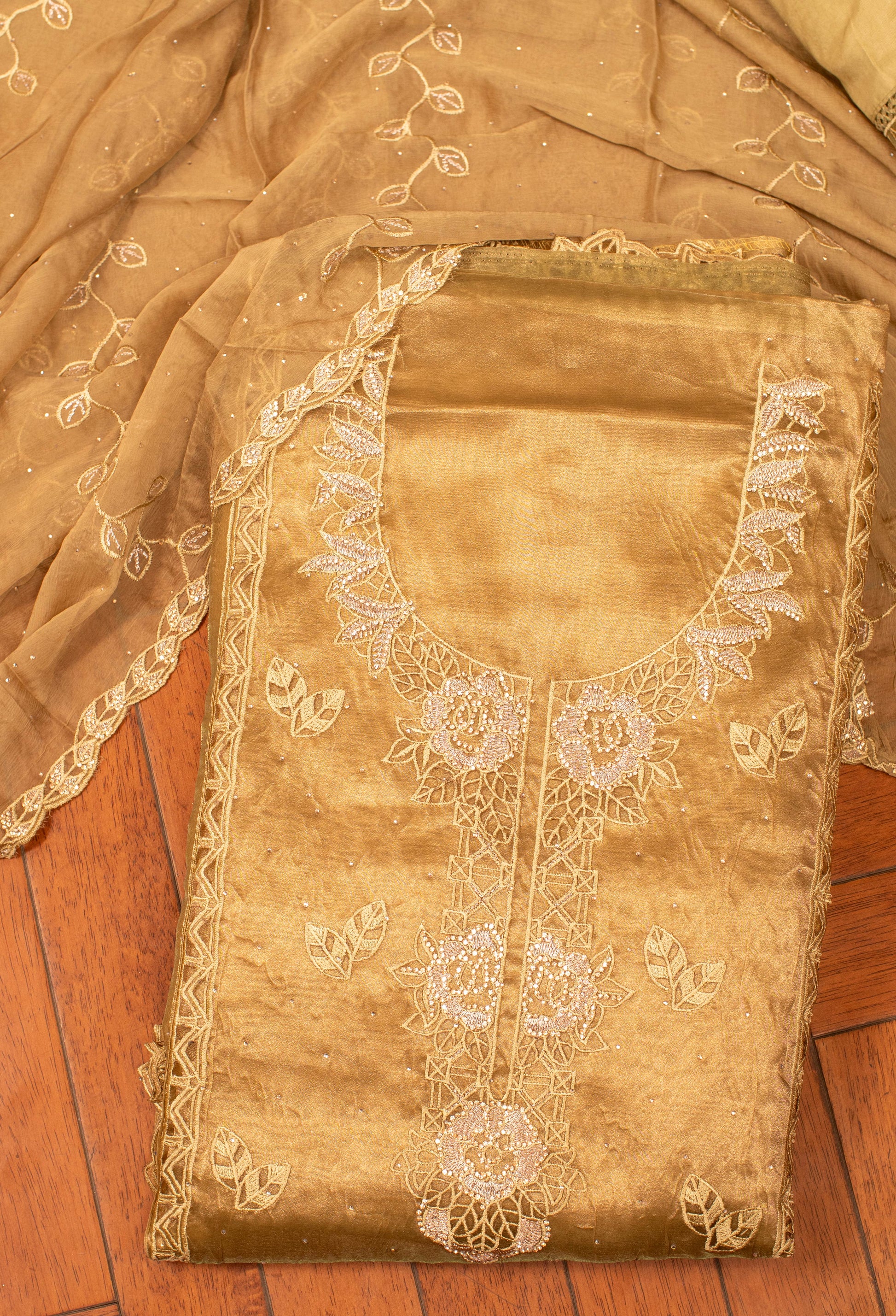 Add a touch of elegance to your ethnic collection with this Golden Embroidered Dress Material Set, designed for refined festive and occasion wear. This unstitched ensemble features a beautifully embroidered top fabric adorned with intricate floral and leaf motifs, enhanced with delicate sequin detailing for a subtle shimmer.